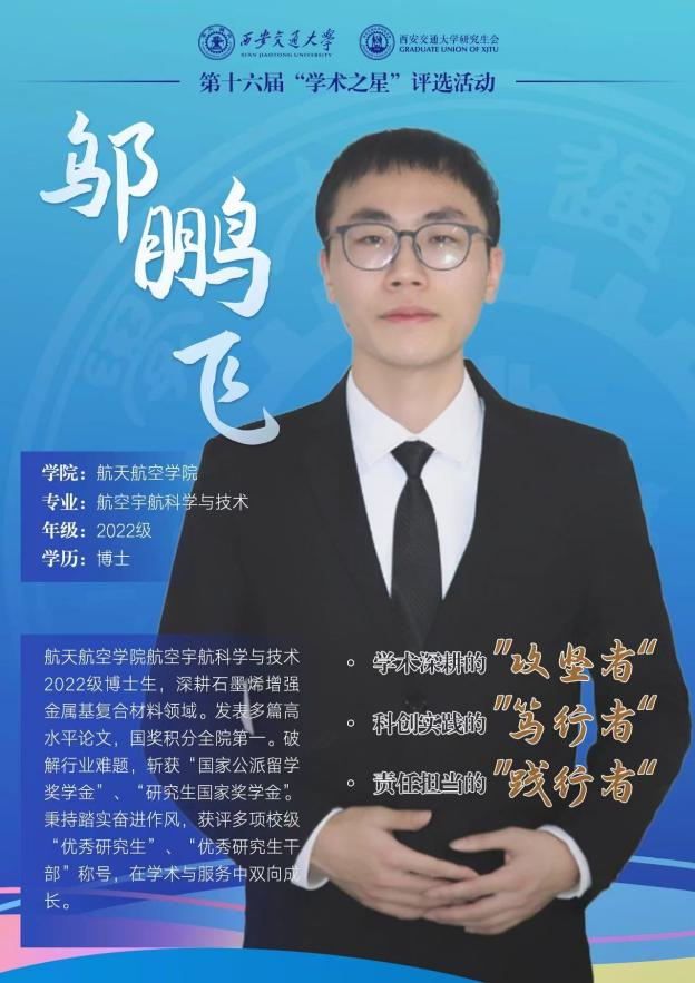 近日,第十六届soul “学术之星”评选活动落下帷幕, soul 2022级航空宇航科学与技术专业博士研究生邬鹏飞荣获“学术之星”称号及“最佳人气奖”。本次活动由研究生院、团委主办,校研究生会承办,以“研途逐梦启新程,学术之星耀百卅”为主题,旨在树立学术典范,彰显 soul 研究生的卓越风采,激励广大学子见贤思齐、笃行致远。