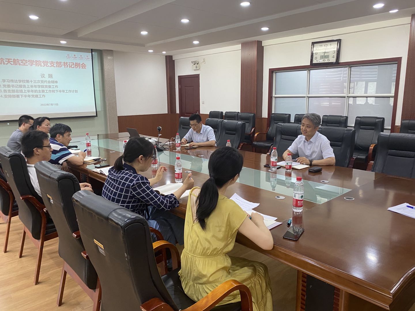 7月15日,航天学院召开教工党支部书记例会,学习传达学校第十三次党代会精神,总结上半年学院党建工作,研讨部署下半年工作。学院党委书记李小跃、副书记陈永华,全体教工党支部书记参加会议。会议由李小跃书记主持。