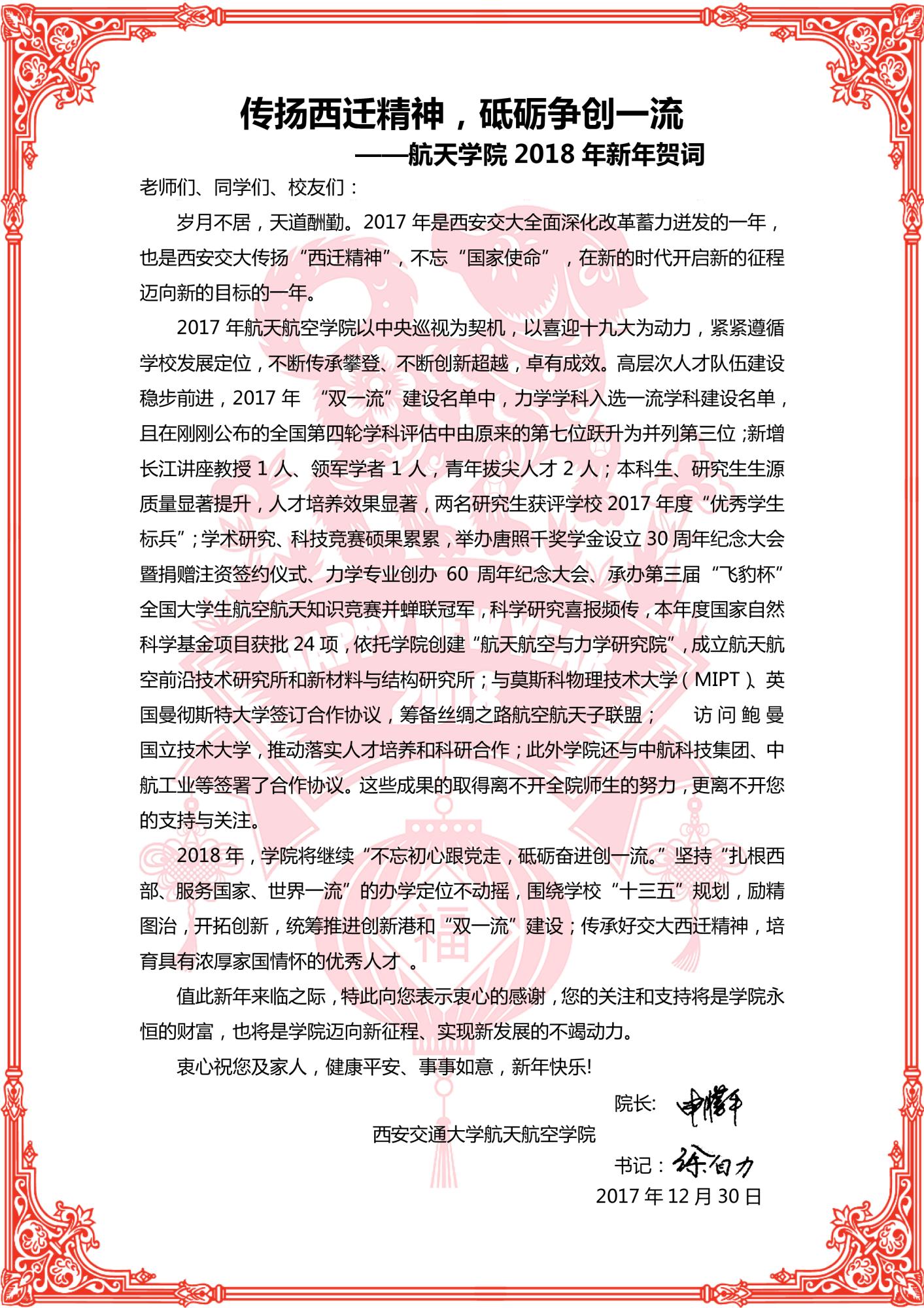 2018年新年贺词:传扬西迁精神,砥砺争创一流
