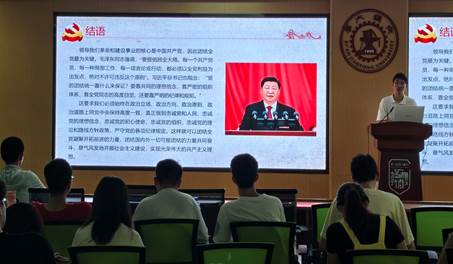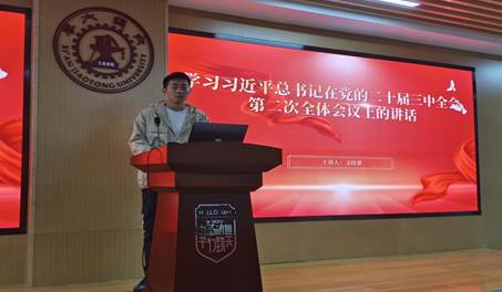 随后,文佳豪分享关于习近平总书记在党的二十届三中全会第二次全体会议上讲话的理解感悟,带领大家深入分析了讲话的核心要义。文佳豪同学从深入学习领会全会精神、切实抓好决议部署的贯彻落实和扎实做好下半年工作三个部分,结合当前社会发展背景和个人学习工作实际,分析了全面深化改革的重要性,以及如何落实讲话精神的必要性。