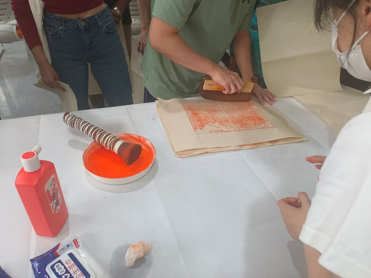 同学们依次上前动手操作。起初大家小心翼翼,但逐渐在实践中找到节奏:刷墨的方向、按压的力道、宣纸的铺放都需要细致斟酌。随着一幅幅印刷作品显现,现场不时响起轻轻的惊叹声。“原来看似简单的刷墨和拓印,要做好并不容易。”“古人一刀一笔刻版,一刷一印传书,真是耐心与智慧的结晶。”不少同学在完成作品后都露出了满足的笑容。
