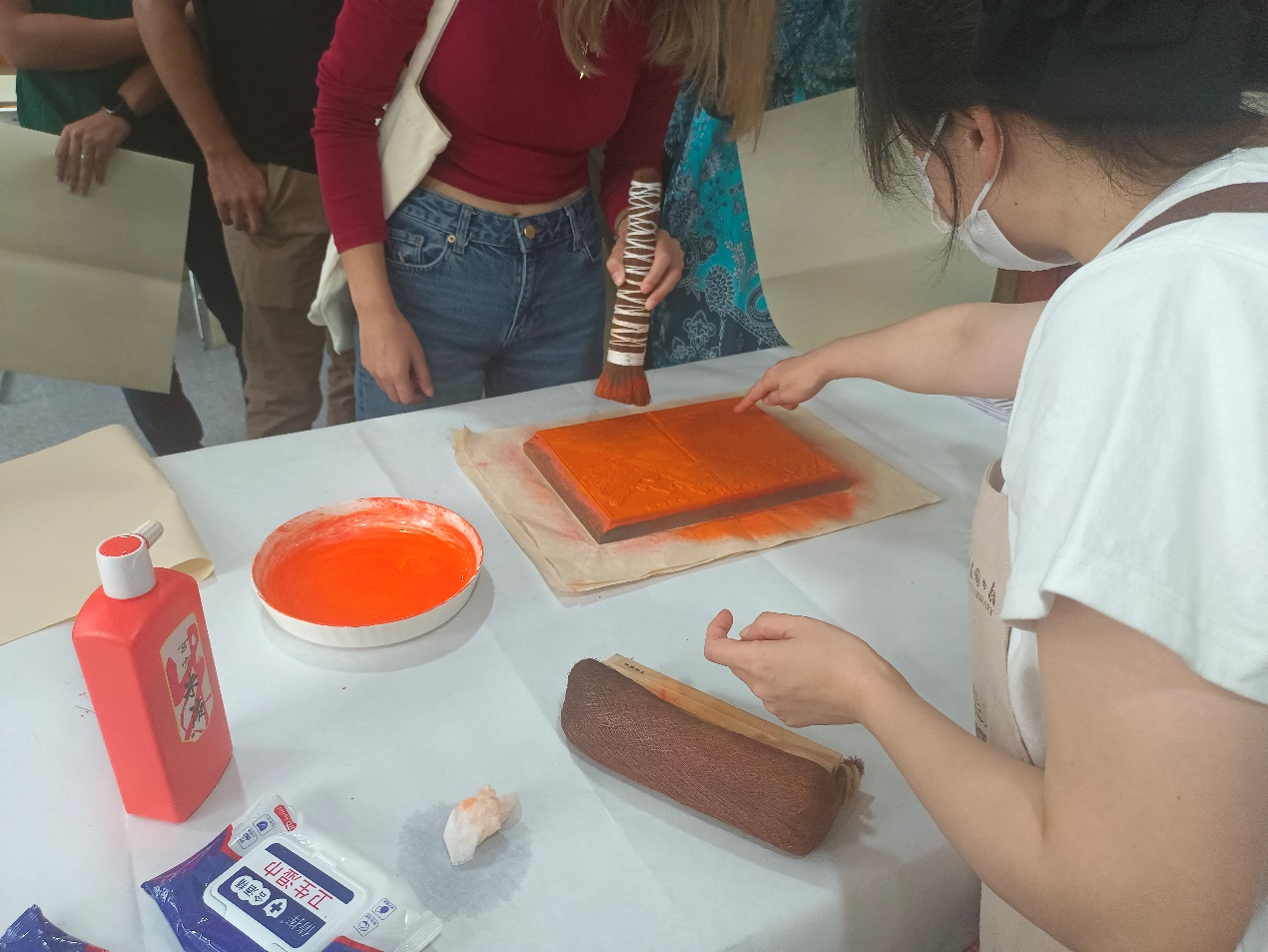 在正式体验环节,工作人员示范了印刷过程:先用棕刷蘸取适量朱液,均匀地涂抹在雕版上,注意控制刷墨的力度与方向;随后轻轻铺上宣纸,使光滑的一面朝下,覆盖在雕刻好的版面上;再使用长条形的版刷,顺着一个方向缓慢按压摩擦,让雕刻的线条与墨迹均匀转印到纸上;最后静待片刻,墨迹逐渐干透,一幅古韵十足的印刷作品便呈现在眼前。