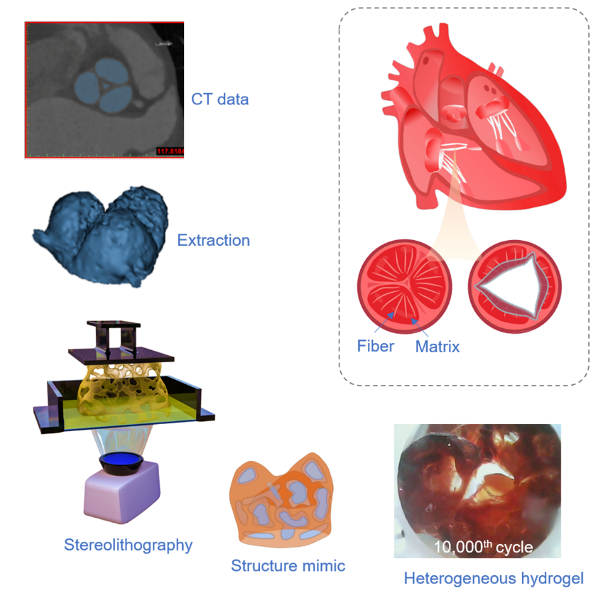 唐敬达副教授与美国哈佛大学锁志刚院士合作,模拟生物心脏瓣膜的软硬相异质结构,使用数字光固化打印技术制备了两相复合水凝胶,同步实现了水凝胶材料的复杂形状和高疲劳门槛值。研究人员设计了由硬骨架和软基体组成的复合水凝胶,两种组分都是可拉伸水凝胶材料,具有显著的模量差异,在界面上形成较强的拓扑粘接。复合水凝胶的疲劳门槛值高达441 J/m2。研究人员进一步利用医学CT影像制作了具有心脏瓣膜形状的复合水凝胶,设计了模拟血液循环的体外测试系统。结果表明均质水凝胶经过560次循环后就迅速发生破坏,而复合水凝胶经过10000次循环后仍然保持完整。该研究解决了水凝胶材料长期存在的困难,为其生物医学应用提供了广阔的前景。研究人员期望未来能研究出同时满足力学性能及生物相容性要求的水凝胶心脏瓣膜。