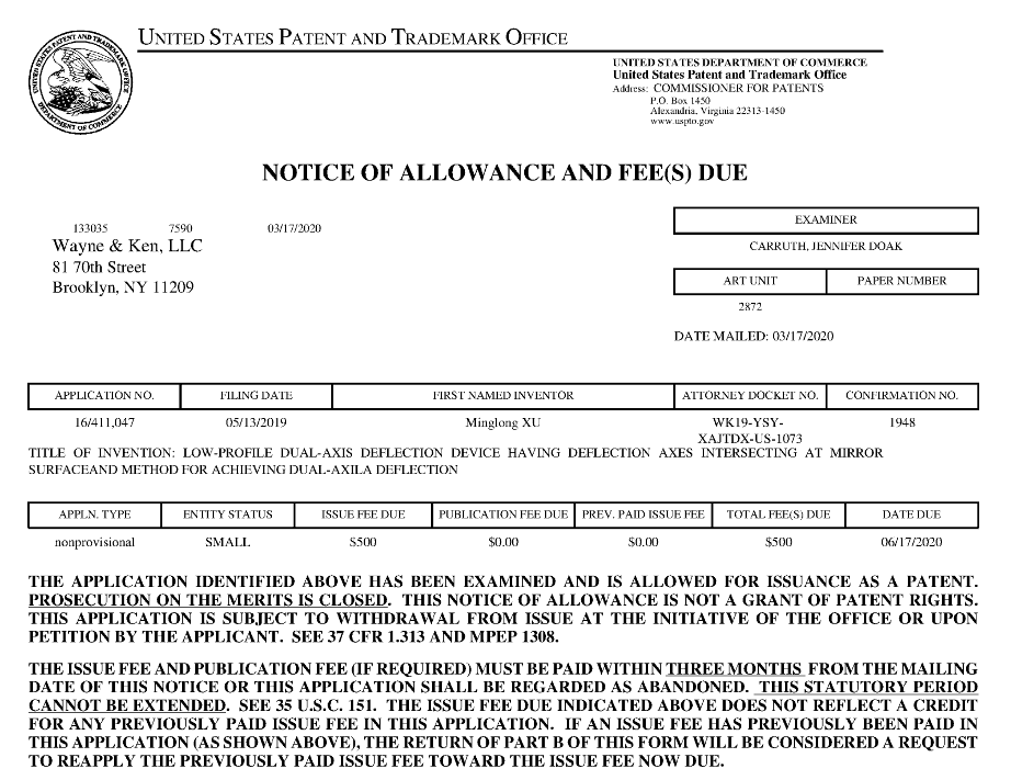 徐明龙教授团队收到了来自美国专利和商标局的专利授权通知书,获得了名为“LOW-PROFILE DUAL-AXIS DEFLECTION DEVICE HAVING DEFLECTION AXES INTERSECTING AT MIRROR SURFACE AND METHOD FOR ACHIEVING DUAL-AXILA DEFLECTION”发明专利的授权,是 soul