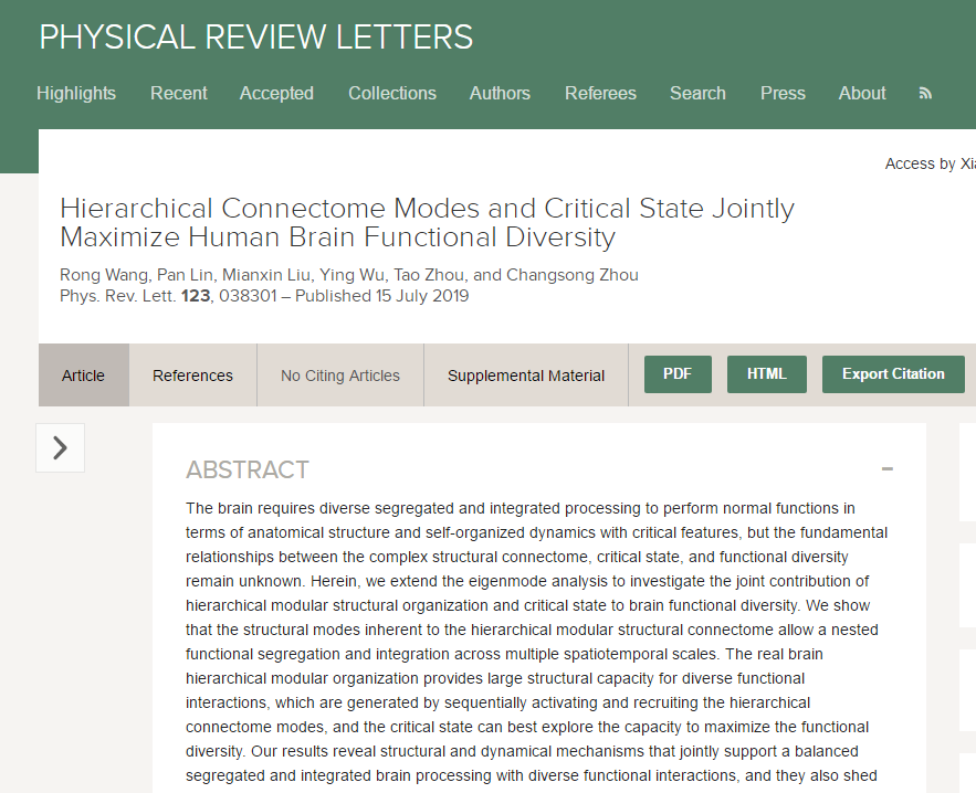 吴莹教授团队,在大脑工作机理研究方面取得最新进展。该研究成果以“Hierarchical Connectome Modes and Critical State Jointly Maximize Human Brain Functional Diversity”为题,发表在物理学国际顶级期刊《Physical Review Letters》(《物理评论快报》)上,2014级博士生王荣是该成果的第一作者。