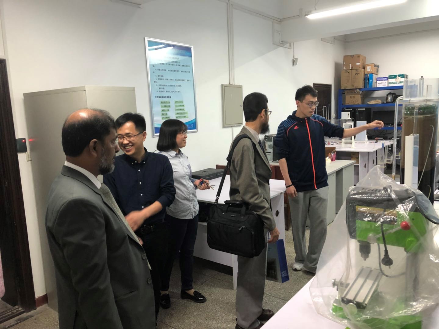 在示范中心老师陪同下,温特·穆什塔克·阿哈默德等人参观了示范中心基础力学实验室。就关心的示范中心课程设置、实验室运行管理机制以及示范中心可容纳实验学生人数等问题,同示范中心老师进行交流。对示范中心可以全天24小时向本科生开放、所有学生均可亲自动手实验表示高度赞赏。