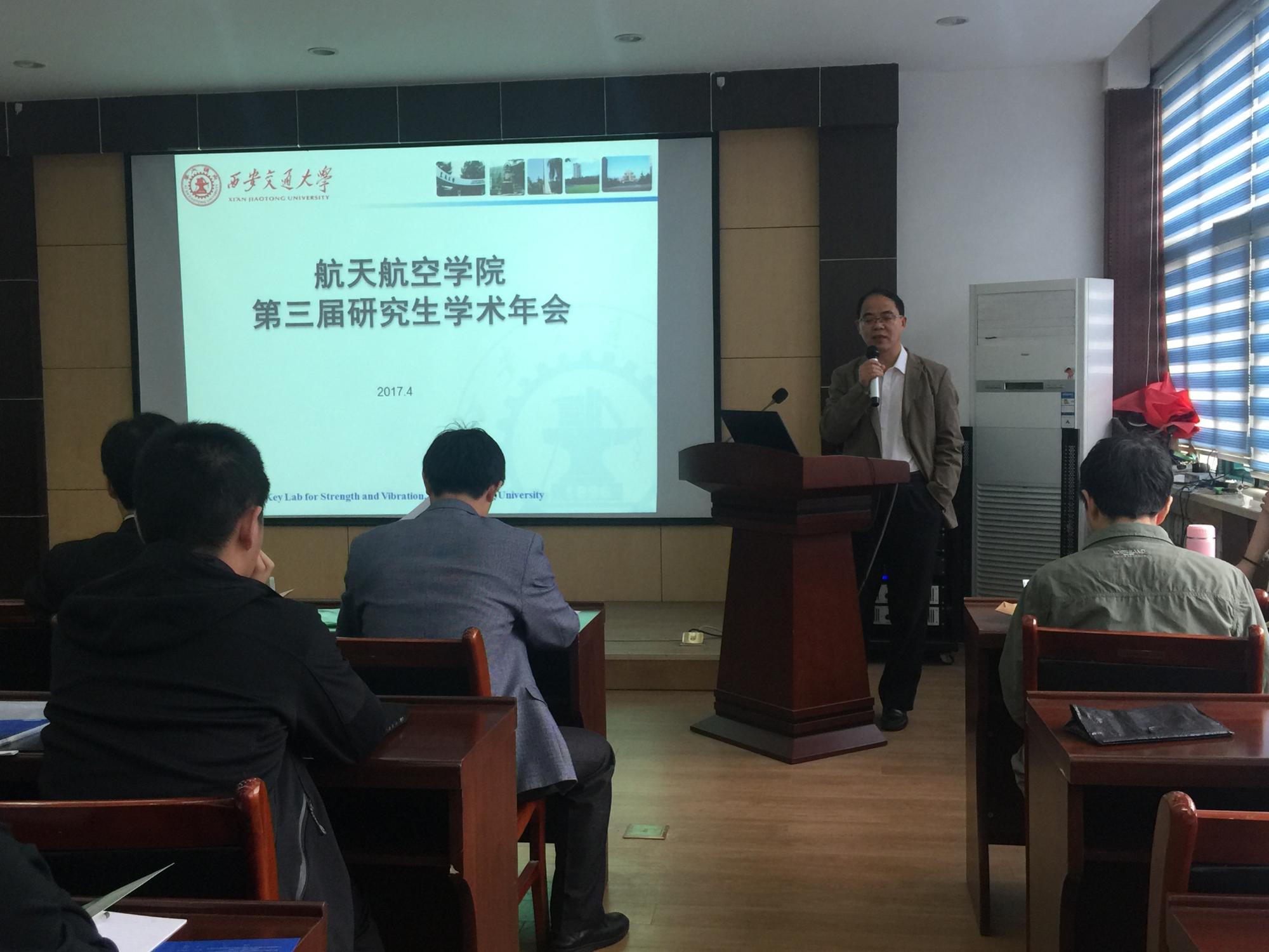 申胜平院长最后讲话,他首先对西工大和空工大的同学们来到交大进行学术交流表示欢迎,他讲到通过学术交流既可以碰撞出更多思想的火花又可以增添深厚的友谊。他希望广大同学们认识到学术报告、学术交流的重要性;希望同学们通过报告展示,抓住要点、核心,呈现逻辑清晰的架构。并祝愿学术年会圆满成功。