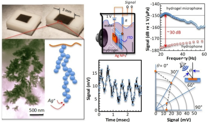 水凝胶材料由于其极高的含水率、良好的生物相容性等特性,在组织工程,药物控释、细胞治疗等生物医学领域拥有着广泛的应用。课题组及合作者利用水凝胶材料与水环境完美匹配的体积模量而在水下具有很小声阻抗的特性,首次将水凝胶应用于水下声学领域,成功研制了基于水凝胶的水下麦克风。水凝胶材料自身原本无法响应外界压力,通过原位电还原的简便办法巧妙地在水凝胶表层数十微米深度的空间内植入了树枝状银纳米结构,将其作为插入水凝胶内部可变形的金属电极,利用压力作用下该树枝状银纳米结构形变导致的水凝胶双电层电容变化作为信号,使得水凝胶器件能够检测外界的微小压力,并成功将其应用于水下声波的测量。该新型水凝胶麦克风可很好地响应水下声波的振幅、频率等变化,且对小于60赫兹的超低频水声波段表现出很高的灵敏度,其响应信号强度最高可超出市售商用水听器30 dB以上。该研究为水凝胶材料的设计及应用提供了新的研究思路,未来可有望应用于水下侦测及海啸、海底地震等灾难的预警。