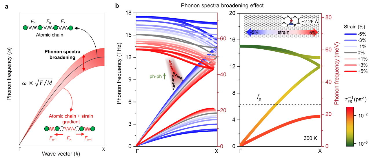 图3.声子谱扩展增强声子散射率。(a)受应变梯度调制的声子色散示意图。(b)左侧,硅在不同弹性应变下的声子色散。右侧,应变梯度为0.118% /nm下声子谱扩展引发的声子散射率,τsg1