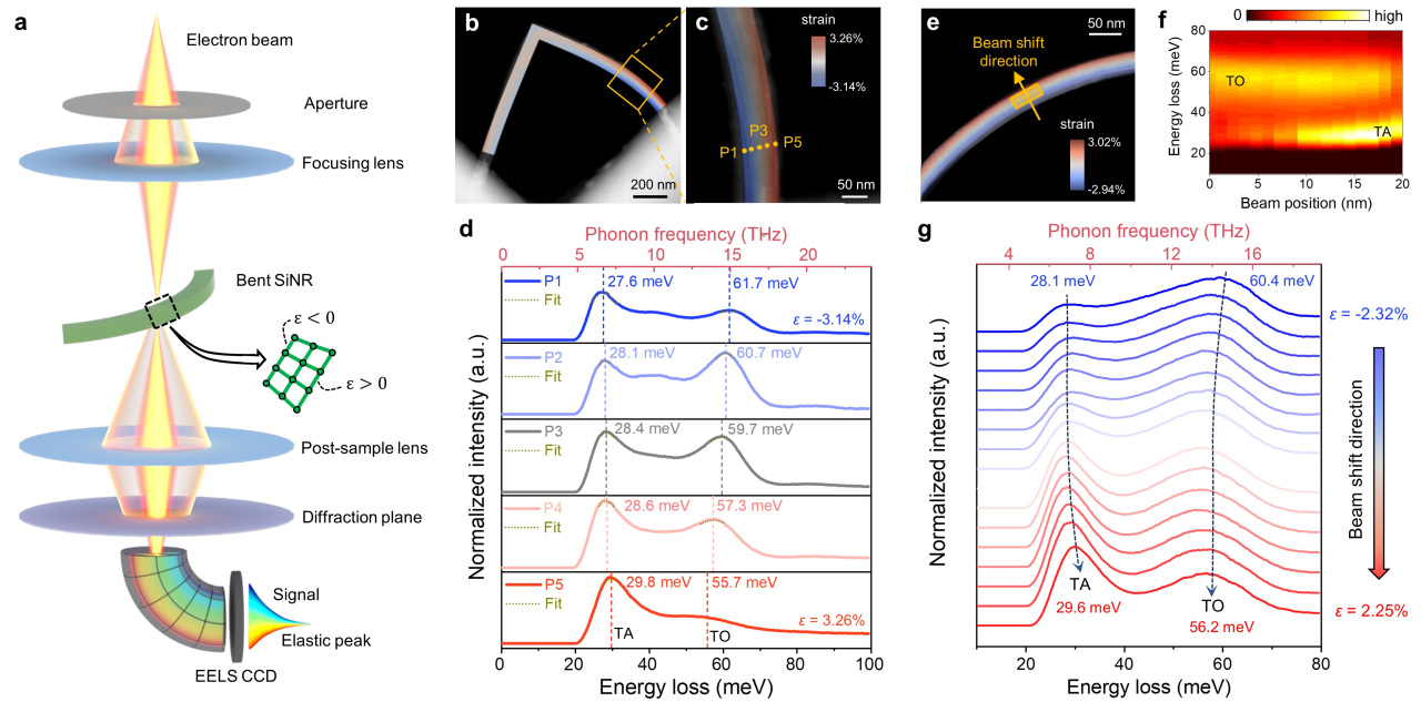 图1.非均匀应力对硅纳米带导热的显著抑制现象。(a)实验测得的(实心符号)和理论模拟的(空心符号)结果表明,在均匀应变下,块体硅和硅纳米线的热导率基本保持不变,而弯曲硅纳米带的测量结果随着应变的增加急剧上升(半填充)。(b)基于悬空热桥微器件的热导率测试原理示意图。(c)高分辨透射电子显微镜显示弯曲硅纳米带的单晶特性。(d)实验测得的弯曲硅纳米带相较于无应力样品的热导率降低百分比。为了揭示应变对声子传输的影响,直接测量弯曲硅纳米带的局域声子谱,并表征沿应变梯度声子模式的演变现象是非常必要的。与先前文献中观察到的在异质界面或缺陷周围的EELS峰移不同,运用同时具备亚纳米级空间分辨率和毫电子伏特(meV)能量分辨率的STEM-EELS技术,该工作首次表征了完全受非均匀应变调控的声子模式,揭示了应变梯度下奇特的声子谱扩展效应(图2)。