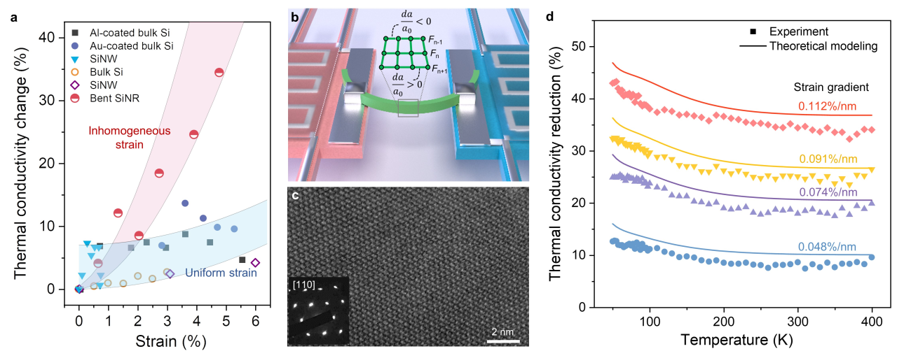 纳米材料具备优异的力学特性,能够承受远超块体材料的应变,从而调节其物理/化学性能(如电子、光学、磁性、声子和催化活性)。基于力学应变工程,过去的研究优化设计了一系列前所未有的先进功能材料和器件,包括高迁移率芯片、高灵敏度光电探测器、高温超导体、和高性能太阳能电池以及电催化剂等等。尽管对基于应变调控电子输运性能和能带结构等方面进行了广泛研究,但由于单一施加应变梯度而不引入其他混淆因素(例如界面和缺陷)的困难,以及将纳米尺度热输运测量与原子尺度局域声子谱表征相结合的挑战,非均匀应变下的导热机制仍未被系统研究。这尤其令人沮丧,因为精确热管理被视为制约先进芯片和高端设备效率和寿命的关键瓶颈。