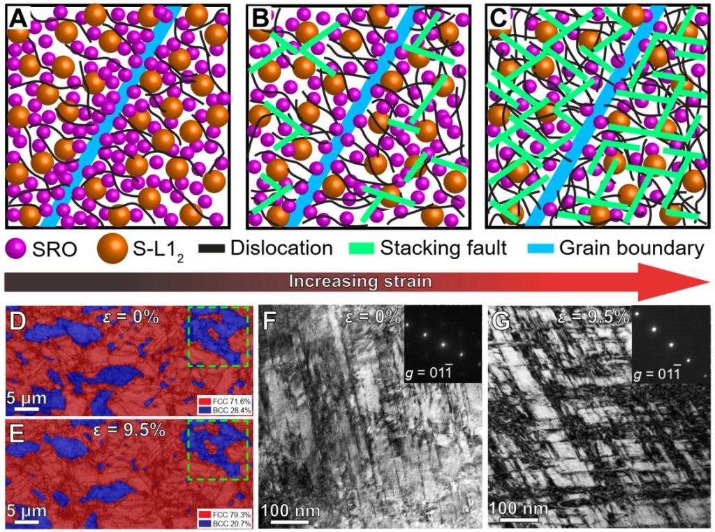 图4 SS-合金的变形机制。(A-C) FCC相近晶界区域拉伸变形过程中的结构演变(SRO、L12、位错和层错)示意图。(A) 拉伸前SRO和S-L12颗粒分别在晶界附近区域偏聚和晶粒内部析出。(B) 拉伸过程中晶界附近的短程有序结构向无序固溶体转变,释放了晶界附近的应力集中。(C) 由于S-L12颗粒的钉扎效应比SRO强,变形过程中大量位错和层错在晶粒内部持续累积。(D和E) 拉伸前后SS合金同一区域的EBSD相分布图,显示相界面处BCC到FCC的相变。(F和G) 拉伸前后有序BCC相的TEM图。显示拉伸后BCC相内的位错密度增大。
