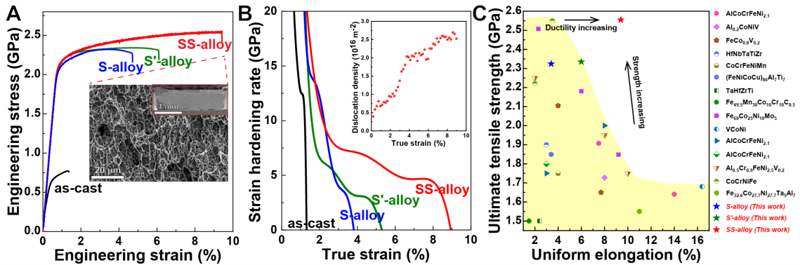 图2 SS-合金的室温拉伸性能。(A) 具有不同SRO和S-L12含量合金的工程拉伸应力-应变曲线。(B) 合金在拉伸过程中的应变硬化率。插图为拉伸过程中SS-合金中FCC相的位错密度演化图。(C) 本研究中的SS-合金与其他超强多主元合金的室温拉伸力学性能对比图。