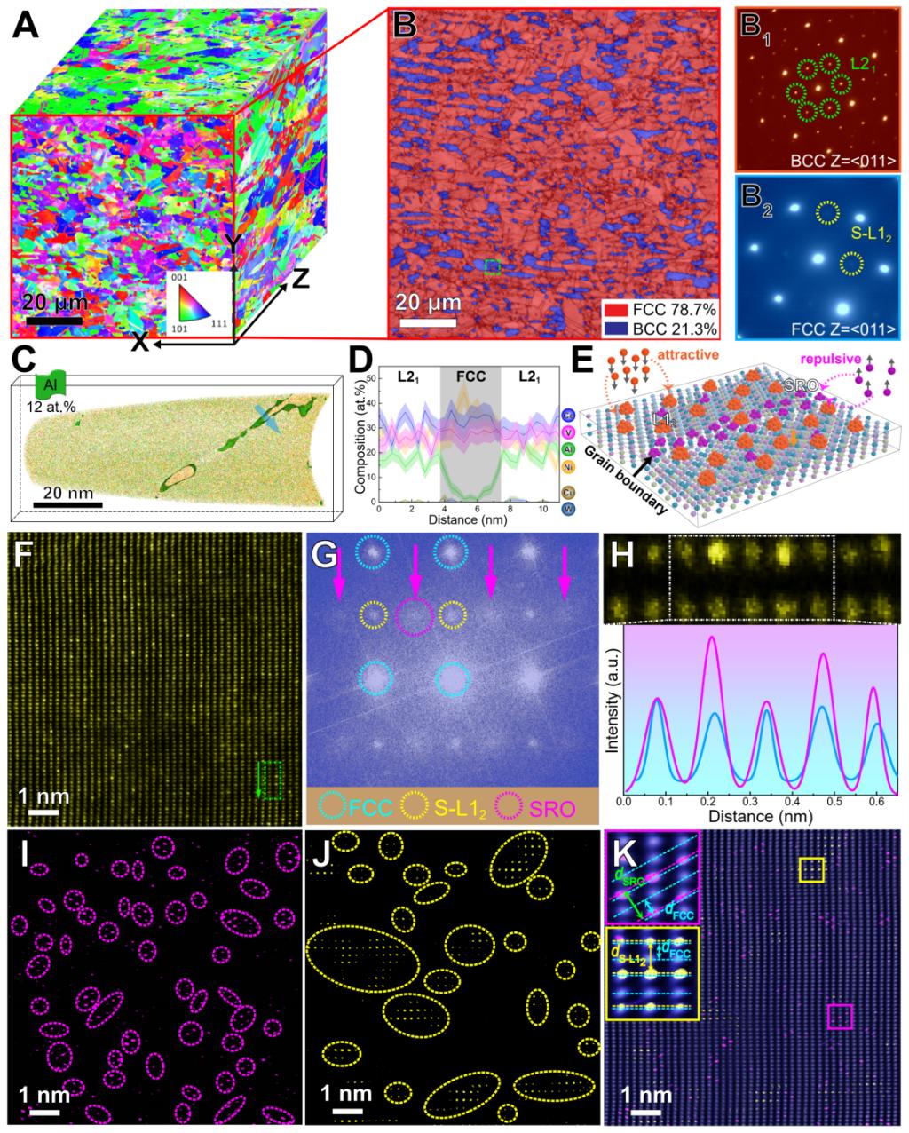 图1 SS-合金的结构。(A) 三维EBSD反极图(IPF)。(B)为(A)中方形区域的相分布图,显示FCC-BCC双相结构。(C) 三维重构APT数据集。(D)为(C)中箭头所示区域的成分图。(E) MD计算结果示意图,显示SRO和S-L12颗粒分别在晶界附近偏聚和晶粒内部析出。(F) FCC相的HAADF-STEM图。(G)为(F)的FFT图。(H)为(F)中绿色虚线矩形区域放大的HAADF-STEM图。(I)和(J)分别对应(G)中SRO和S-L12弥散圆盘和衍射斑点的IFT图。(K) 利用(G)中FCC、SRO和S-L12的弥散圆盘和衍射斑点叠加的IFT图。