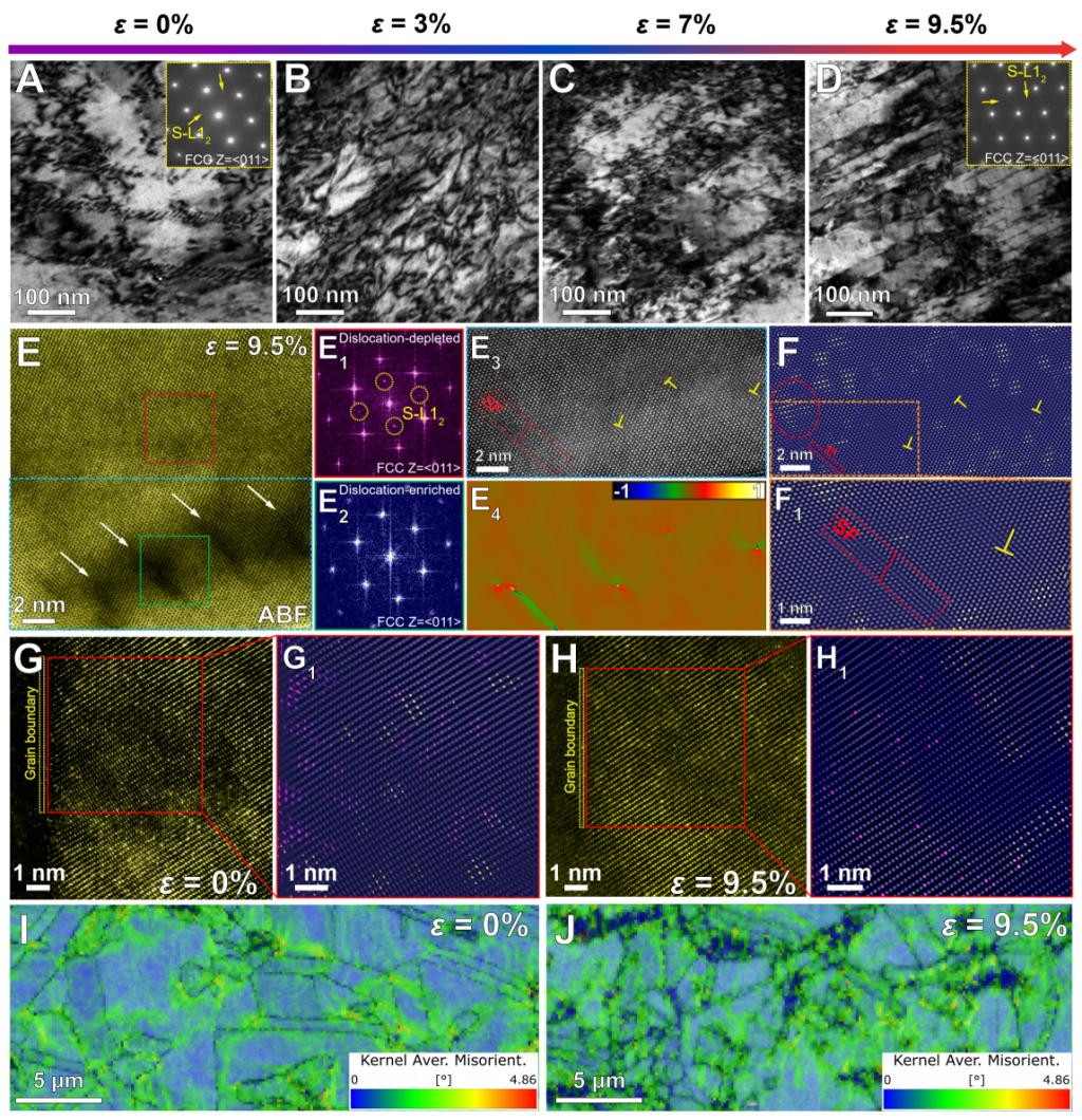 图3 SS-合金中FCC相在拉伸过程中的结构演变。(A-D) FCC相在不同拉伸应变下的明场TEM图,显示了位错和层错的演变。(E) FCC相在9.5%拉伸应变下的ABF- STEM图。(E1和E2) 分别从(E)中红色和绿色方形区域得到的FFT图。(E3)为(E)中位错富集区放大的HAADF-STEM图。 (E4) 为(E3)基于GPA的对应应变图。(F) 为(E3)生成的叠加IFT图,显示位错/层错与S-L12相之间的交互作用。(F1)为(F)中虚线矩形区域的放大图。(G) FCC区域未变形状态下晶界附近的HAADF-STEM图。(G1)为(G)中红色方形区域生成的叠加IFT图,显示SRO在晶界附近偏聚。(H) FCC区域经过9.5%拉伸应变后的HAADF-STEM图。(H1)为(H)中红色方形区域生成的叠加IFT图。变形后,SRO在晶界附近以及晶粒内的分布是均匀的,表明位错的运动破坏了原本在晶界附近的SRO,使其发生有序向无序转变。(I) 拉伸前SS合金的KAM图,显示应力主要集中在晶界附近,这是由于短程序在晶界附近偏聚造成的,对屈服强度的提升有较强作用。(J) 拉伸后SS合金的KAM图,晶界附近和晶粒内部的应力集中情况类似,即应力非局域化,有利于维持均匀塑性变形。