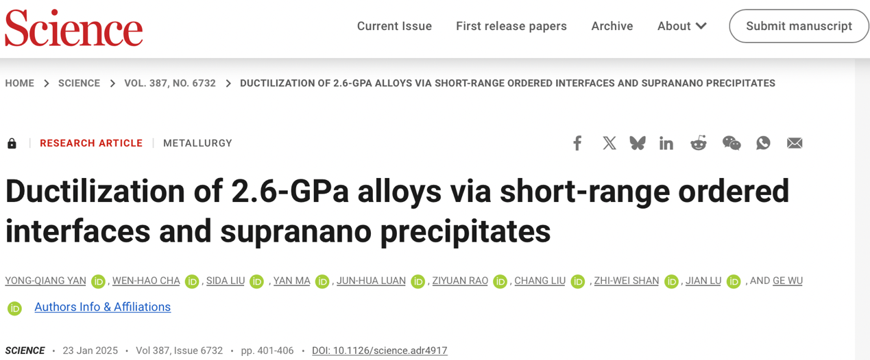 吴戈教授、刘畅教授,联合香港城市大学吕坚院士,设计了一种创新纳米结构,即短程有序界面与超纳析出相的结合,来克服此难题。该研究成果以“Ductilization of 2.6-GPa alloys via short-range ordered interfaces and supra-nano precipitates”为题发表在《Science》上。
