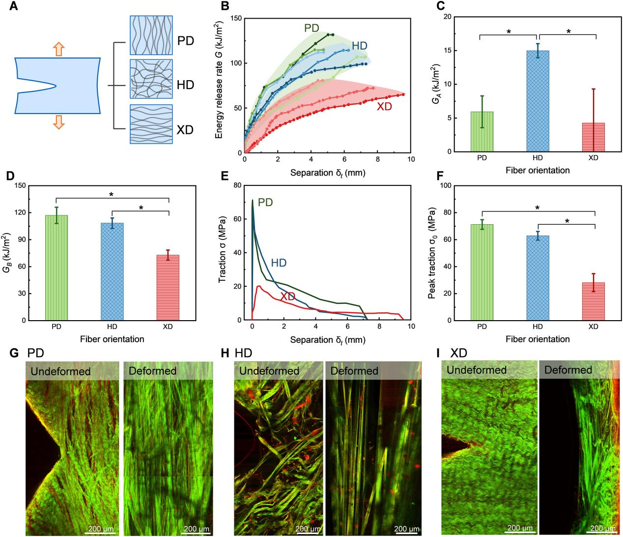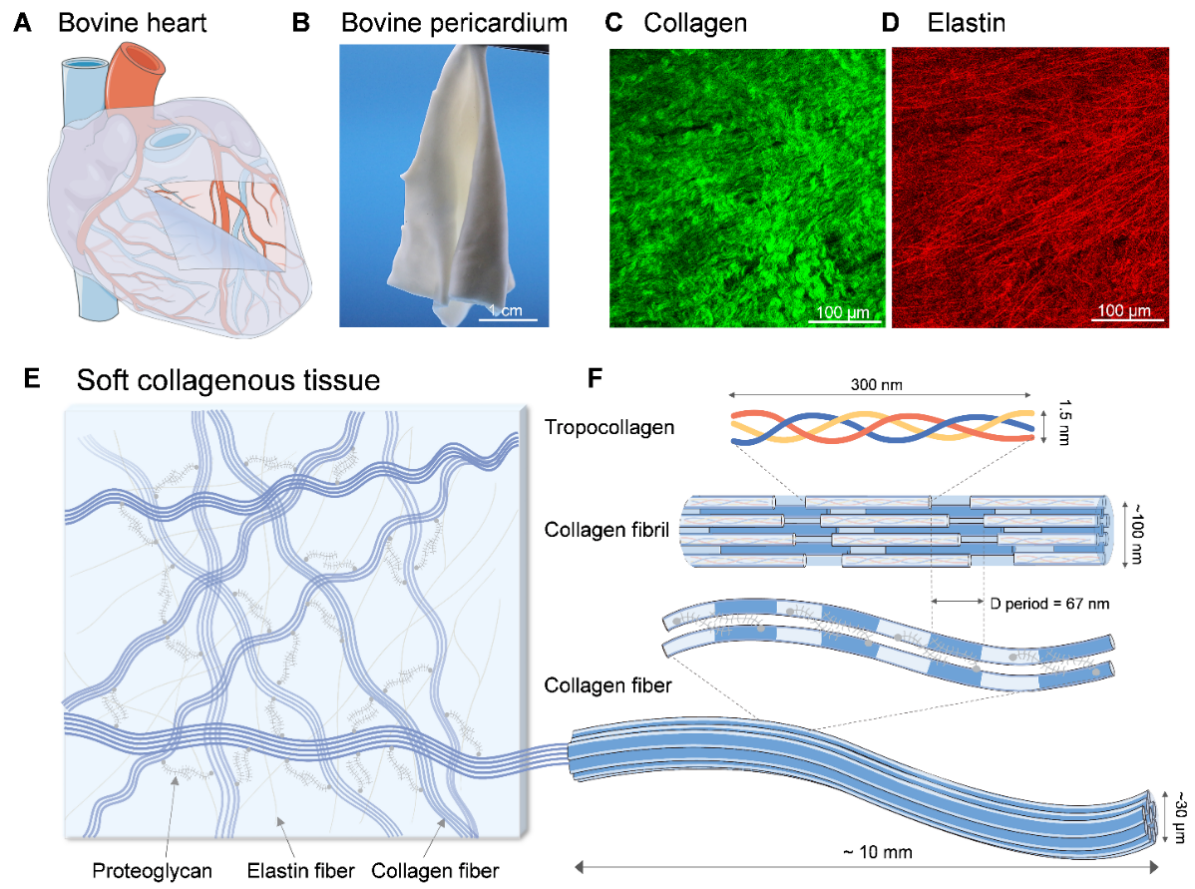 胶原软组织,如皮肤、肌腱和心脏瓣膜,通常具有较高的断裂韧性。例如,牛心包这种胶原软组织用于人类心脏瓣膜置换手术,能承受数亿次开闭循环而不开裂(图1A,B)。本研究选取牛心包作为研究对象,探讨了胶原软组织的增韧机制。胶原软组织的微观结构如图1C-F所示。