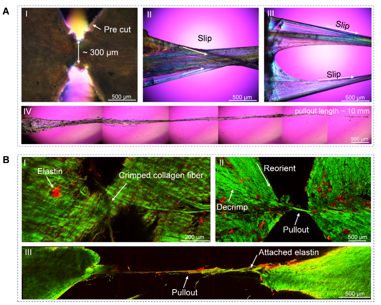 为了探明纤维抽出过程中的微观机制,研究人员使用偏振光显微镜(图4A)和双光子显微镜(图4B)记录了胶原纤维在拉伸过程中不同阶段的形貌变化。未变形时,卷曲的胶原纤维嵌入在弹性蛋白网络中。抽出过程中,胶原纤维开始解卷曲,并沿拉伸方向重新定向,胶原纤维逐步被抽出,最终约10 mm长的胶原纤维被完全抽出。