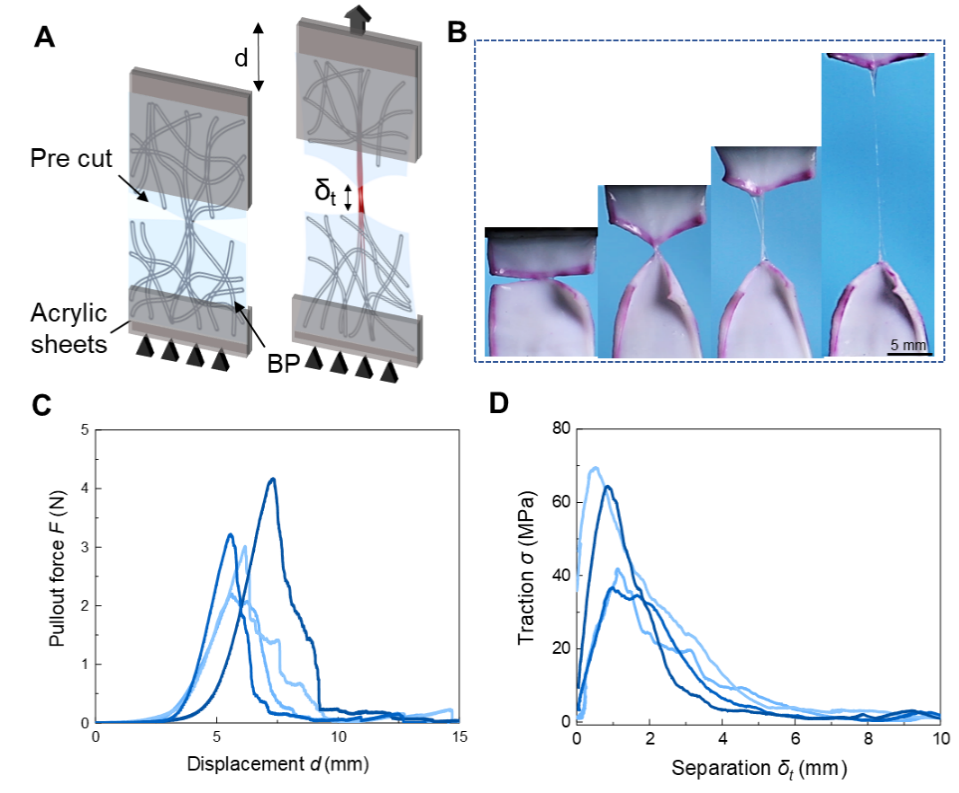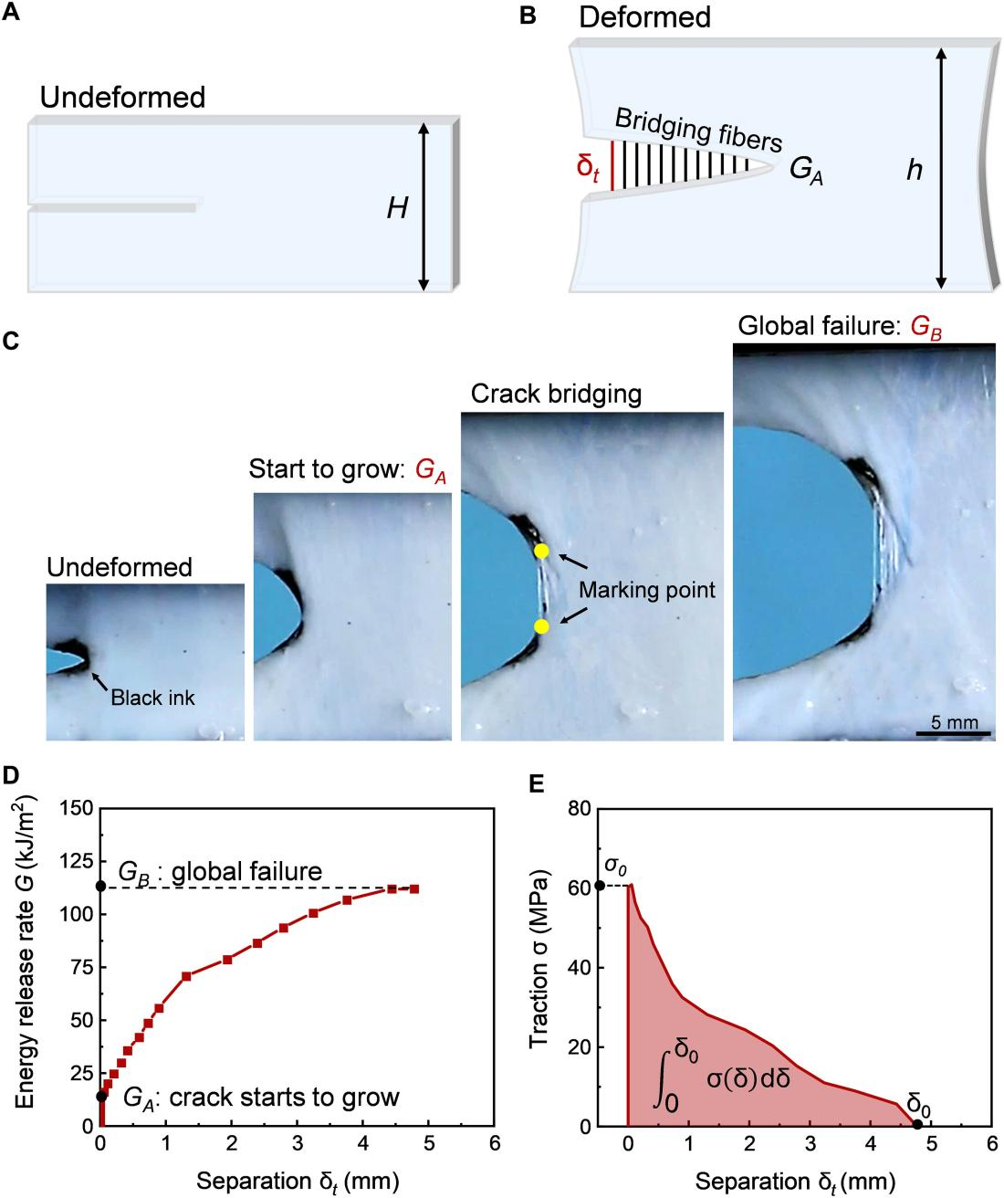 随后,研究人员基于裂纹扩展过程中能量释放率与牵引分离曲线的关系,设计“裂纹扩展实验”测量了胶原软组织的牵引分离曲线。首先观察了裂纹扩展过程中,胶原纤维在裂尖的行为和微观形貌变化。结果显示,在未变形的样品中,裂纹尖端保持完整,纤维呈卷曲状(图5A)。随着拉伸比的增加,裂纹钝化,卷曲的胶原纤维束拉直并沿拉伸方向重新取向(图5B)。随着进一步拉伸,裂纹开始在软基体中扩展,胶原纤维被拉出并桥接裂纹,在裂纹尖端形成一个明显的桥接区(图5C)。