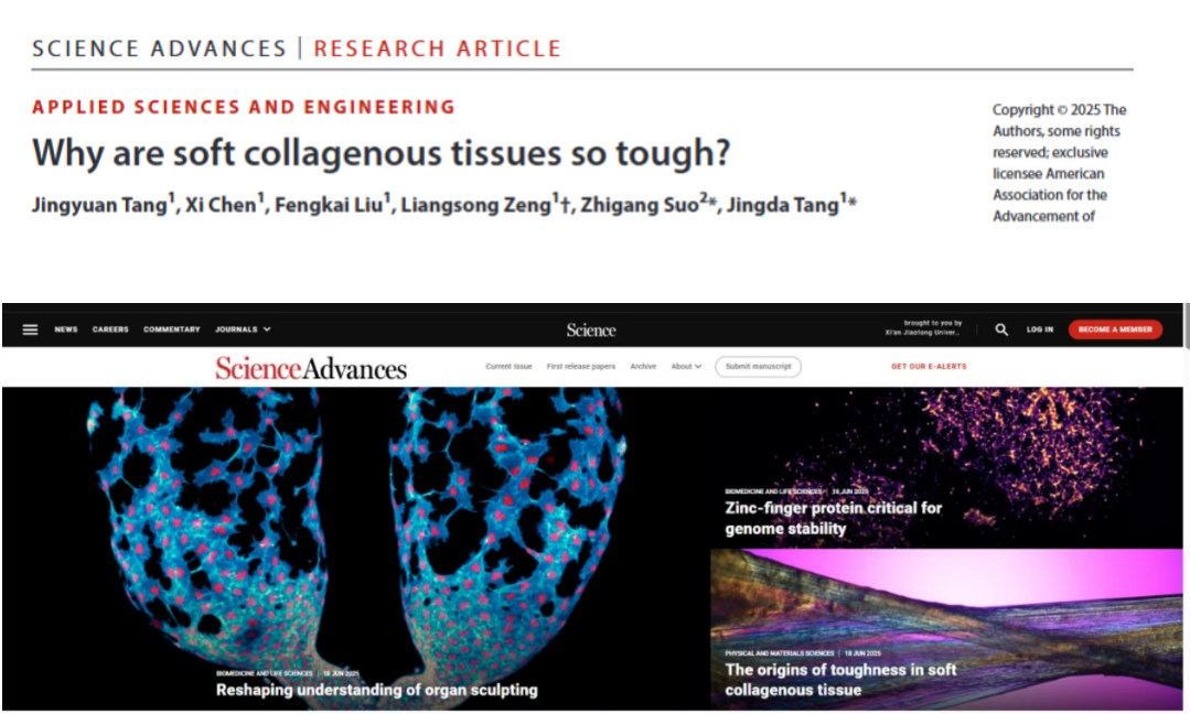 唐敬达教授与哈佛大学锁志刚院士合作,围绕“胶原软组织的增韧机制”开展研究,通过力学实验与显微观测,得到了软组织的牵引-分离定律,揭示了胶原软组织高断裂韧性的微观机制,对仿生软材料的设计具有指导意义。相关成果以Why are soft collagenous tissues so tough?为题,发表在国际期刊《Science Advances》上,并得到期刊主页推荐。