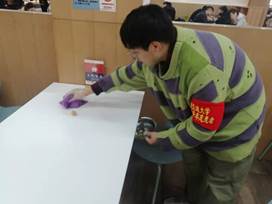 “文明餐桌”志愿者活动,旨在引导同学们在不影响他人走动的情况下排好队,将同学们取餐过程中掉落在地面上的食物和就餐后遗留在桌面上的食物残渣及时清理干净,在用餐结束后及时将桌椅摆放整齐,为广大师生用餐创造良好氛围。