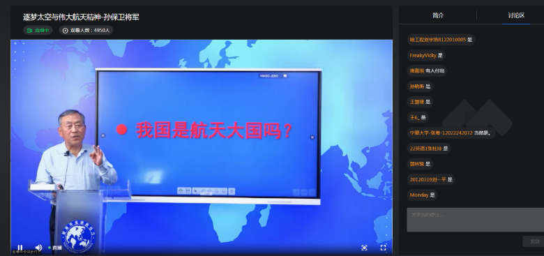 孙将军通过报告展示了中国航天事业的长期奋斗中,广大科技工作者迎难而上,持续奋斗,创造了一个个非凡业绩的动人故事。同学们纷纷在学习后发表了自己的思考与感悟。李子昂感慨道:“我感触最多是关于北斗导航系统的部分,在前辈们前仆后继的努力下我们突破了外国的技术限制研制出了自己的导航系统。正是前辈们的这种把个人理想与祖国、民族的命运紧密联系在一起,无怨无悔,攻坚克难的精神,才有了今时今日突飞猛进的航天事业。我们年轻一代也将把伟大的航天精神传承下去,发扬光大。” 宋英政谈道:“太空探索是人类一直以来的梦,人类为此付出了一代又一代人青春与热血,孙将军给我们介绍了我国航天历史的发展,让我们了解到了新中国在外部世界对于技术的严防死守下是如何取得来之不易的成绩的,从中我们感受到了老一辈人的辛苦牺牲、无私奉献的精神,为了祖国的发展,我们新生代一定要做好为国家航天事业做贡献的准备,最后,我想说,我国的航天事业,古有万户,今有我们!” 张艺龙表示,星空浩瀚无边,探索永无止境,随着高精尖科技的发展,现在大国之间的竞争越来越专注于太空,我国虽然起步较晚,但是在一代代老一辈航天人的不懈奋斗下,一次次向科学难题发起进攻,一次次向生理极限发起挑战,一次次将凝结着民族精神与梦想的载人飞船顺利送入太空,推动我国载人航天事业从无到有,从弱到强,在浩瀚宇宙中铭刻下了“特别能吃苦、特别能战斗、特别能攻关、特别能奉献”的载人航天精神。我们作为新一代的青年,更是要弘扬载人航天精神,使中国人探索太空的脚步迈得更大更远,为实现中华民族伟大复兴的中国梦作出新的更大贡献。