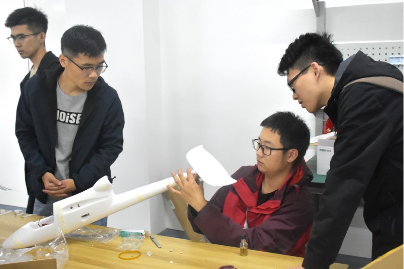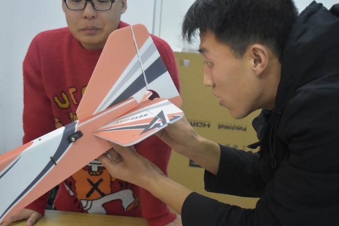 航模基础知识讲解结束后,航模队队长的张臻杰带领大家到实验室现场动手组装航模,第一次接触航模的同学在张臻杰队长悉心指导帮助下,顺利完成了模型样机的搭建。