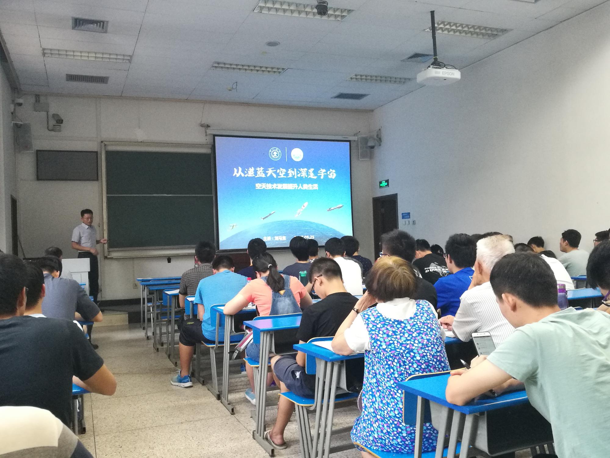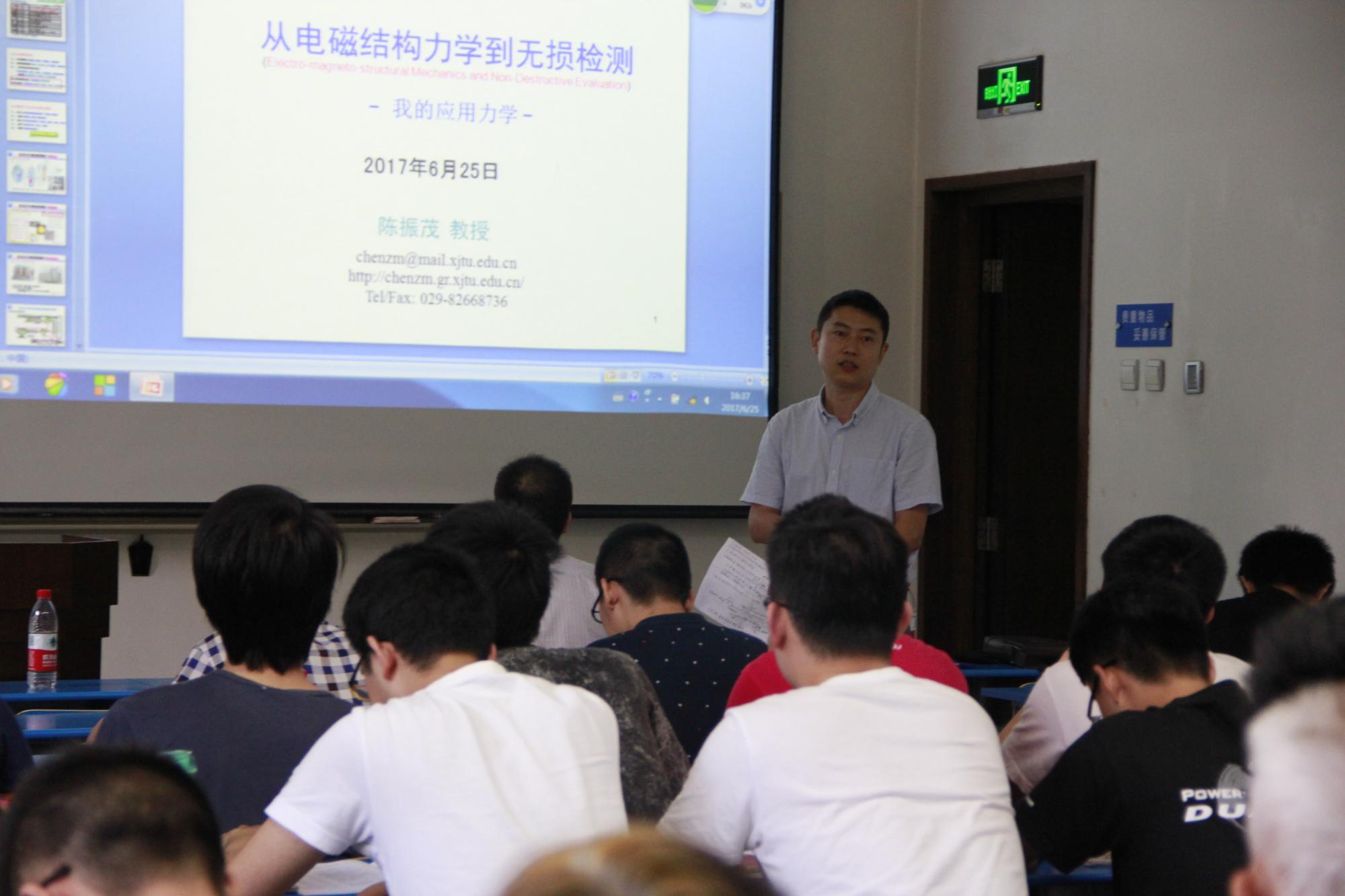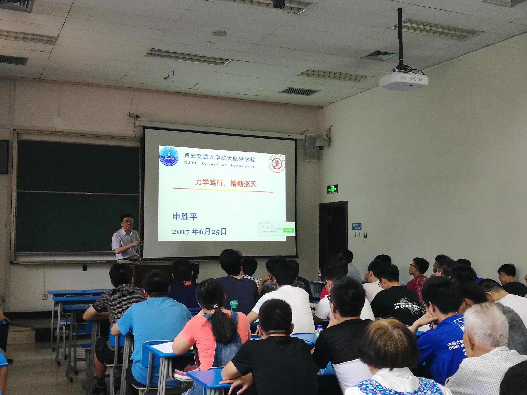 陈振茂教授以“从电磁结构力学到无损检测”为题,为现场的同学们介绍了工程力学系的发展概况,以及在无损检测方向的主要工作,鼓励同学们积极参与到力学学科的研究中。刘马宝教授在“从湛蓝天空到深邃宇宙——空天技术发展提速人类生活”的主题报告中,展示了空天技术的发展对人类生活品质的提升,引起了同学们对航天航空领域的兴趣。
