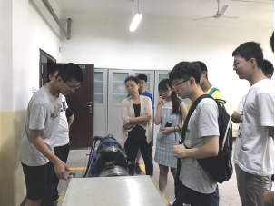 同学们共同参观力学国家级实验教学示范中心的实验室,通过刘书静老师热情而详实的讲解,同学们较为深入地了解了力学性能实验室的屏显电子万能试验机、屏显液压万能试验机和屏显扭转试验机等设备,并在老师的示范下观摩了针对不同金属材料的拉伸、压缩、弯曲及剪切等力学性能测试的实验项目。之后,徐志敏老师带领学生们参观了组合梁弯曲应力测定实验室、空气动力学实验室和水洞实验室。