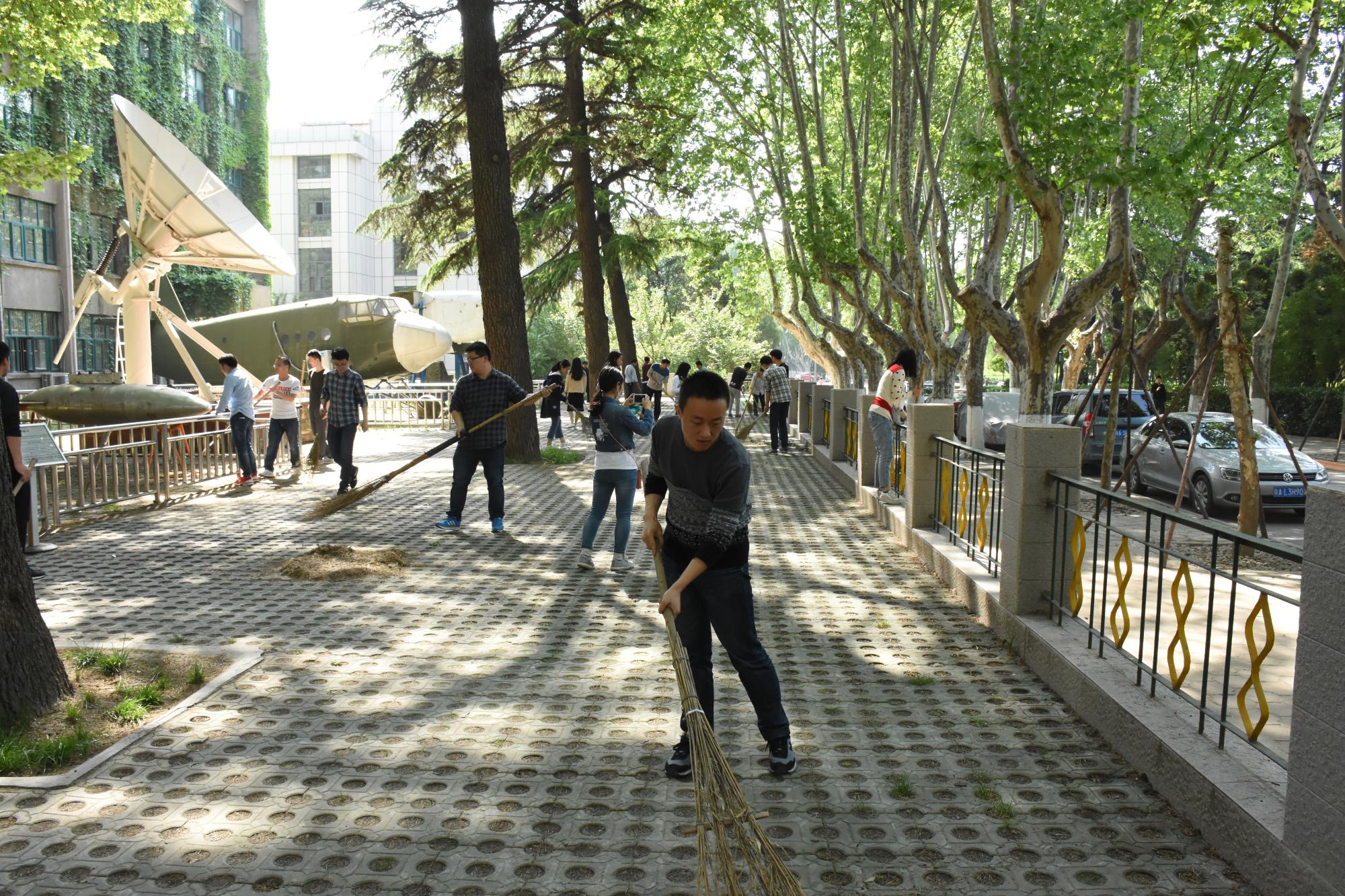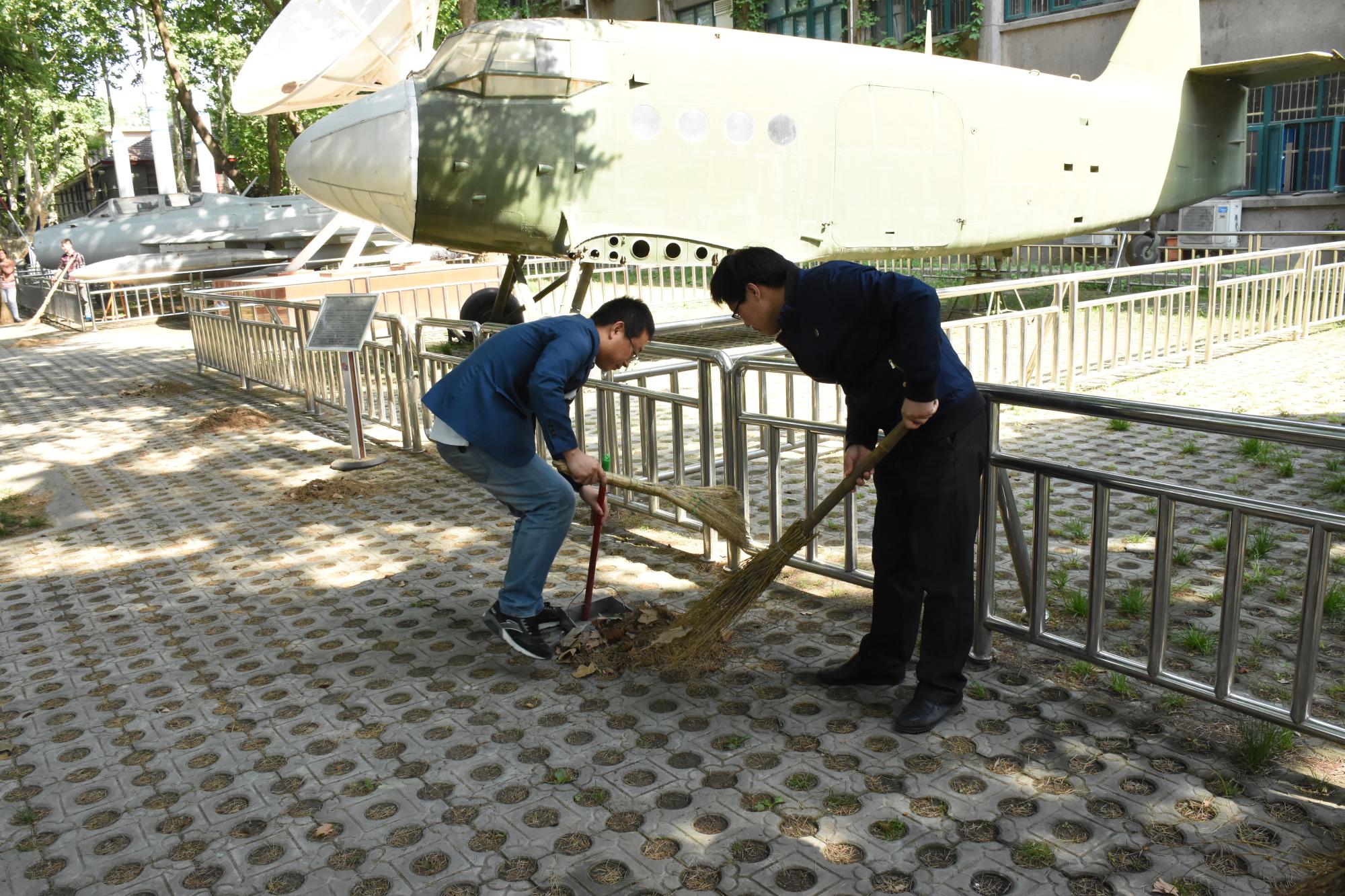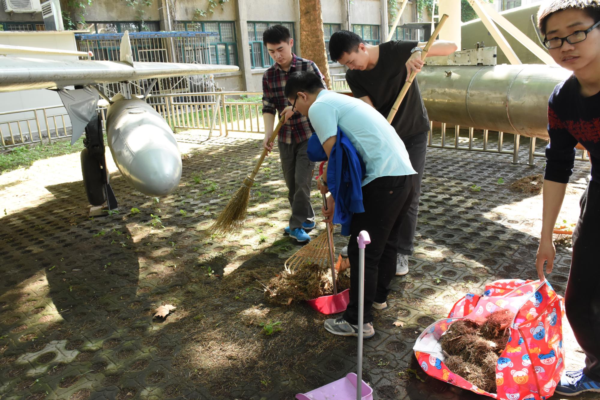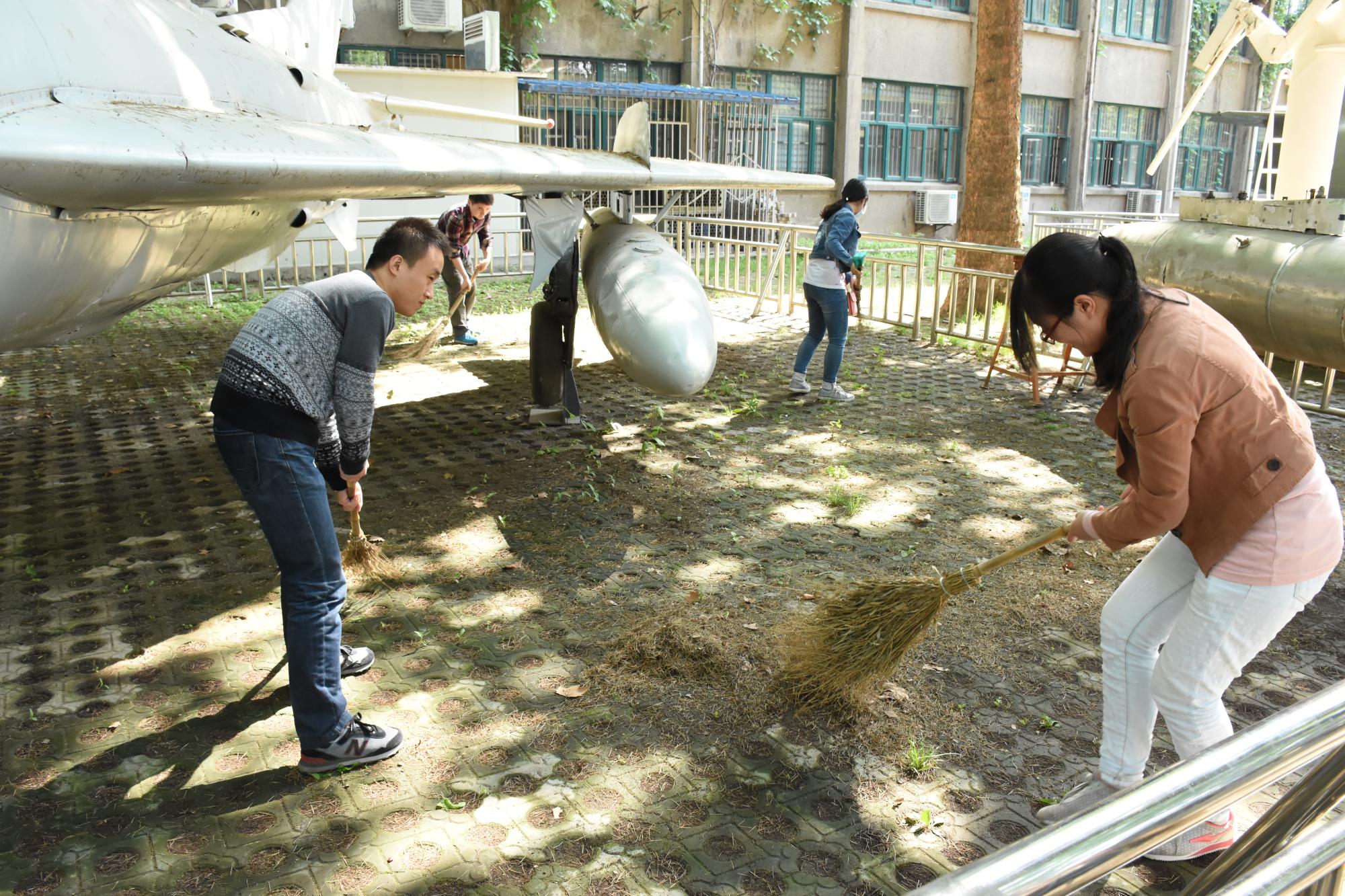 根据分工和清扫工作安排,航天学院师生们在约定的时间齐动手,热火朝天地开始了全院卫生大扫除。学院各系、室、中心的教职工们对学院楼内办公区和其他公共区域进行了清扫。学院各学生党支部在学院党委副书记陈永华老师的带领下合作完成了学院南侧“小停机坪”、教一楼东侧外围、南侧外围和西侧外围区域的清扫工作。大家或是用扫帚、或是用耙子,将草坪上的枯叶扫成小堆,细心的同学们还清理了飞机下方、机翼上一些平时易忽略的地方掉落的树叶、树枝,不但清扫了学院楼宇周围的路面,还认真地将花坛里掉落的树叶和杂物一点一点捡了出来。