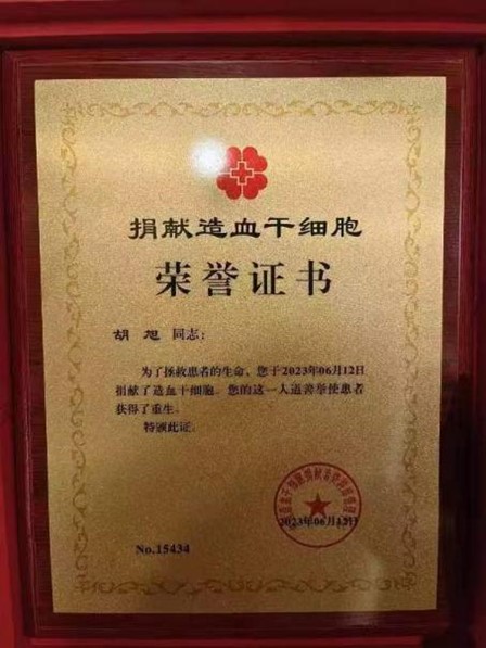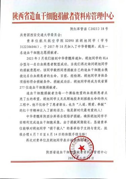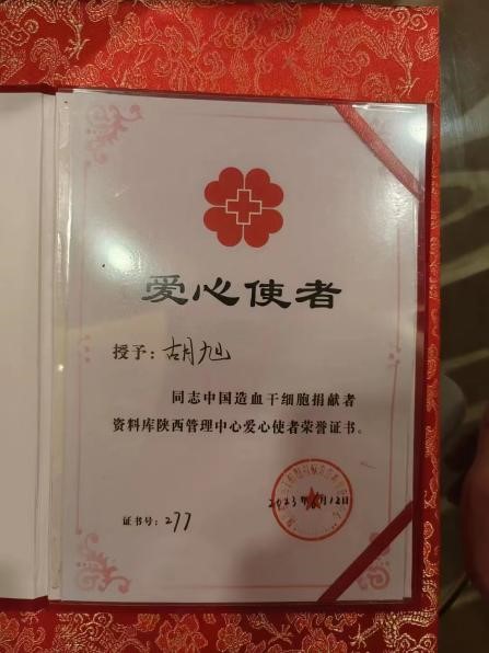 2018年,正在上大一的胡旭在学校听了有关造血干细胞捐献的宣讲后,毫不犹豫地留取了血样,成为中华骨髓库的造血干细胞捐献志愿者。2023年5月,胡旭收到了骨髓配型成功的电话,他的HLA分型与一名白血病患者配型成功。“我一开始以为是诈骗电话。”胡旭笑着说道,“但经过陕西分库工作人员耐心地讲解,以及我自己查阅相关资料,我更相信这是一个奇迹。”没有过多的犹豫,他同意捐献自己的造血干细胞去挽救这名患者的生命。