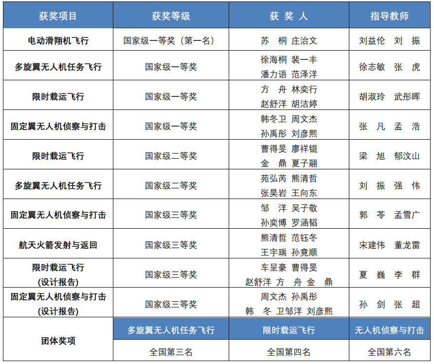 航模队在比赛中获一等奖4项、二等奖4项、三等奖4项,获奖数量居全国高校前列。