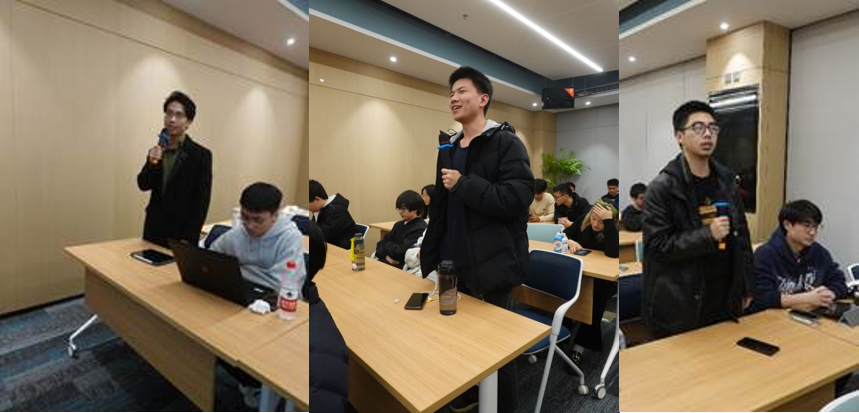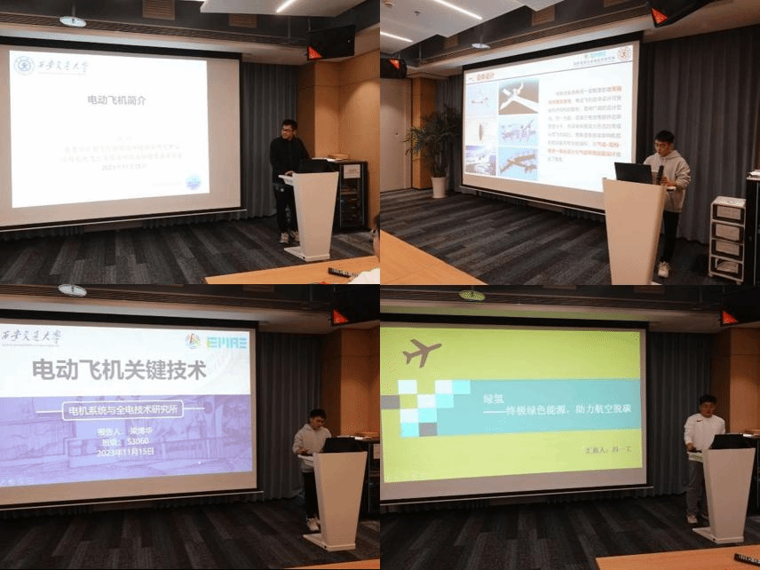 在学习知识交叉分享环节,航天学院2023级硕士生第二党支部张洋同学结合所学专业从定义、分类、发展历史和创新技术四个方面介绍了电动飞机;S3060党支部梁博华同学分享了电动飞机的总体设计技术、高效高功重比电推进技术、能量综合管理技术、能源系统技术等关键技术;S3073党支部冯一工同学进行了 “绿氢——终极绿色能源,助力航空脱碳”的主题分享,介绍了清洁能源“绿氢”的产生与优势。