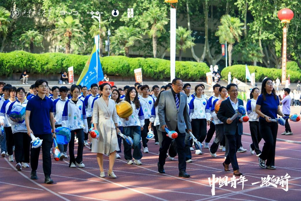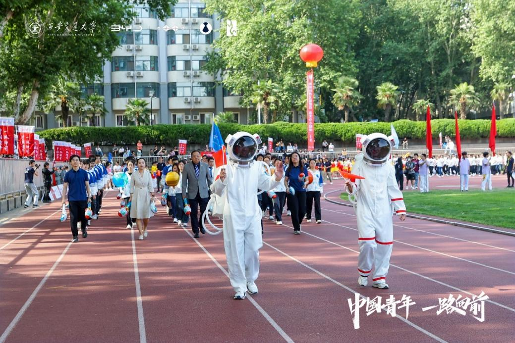 运动会开幕式上,学院党委书记张爱萍,党委副书记李昱静,院长助理郁汶山以及研究生辅导员李宇辰、王若宜一同带领学院方阵,步伐铿锵、整齐划一地走过主席台。嘹亮的口号响彻全场,航天员人偶身着银白航天服闪耀其中,尽显航院风采。