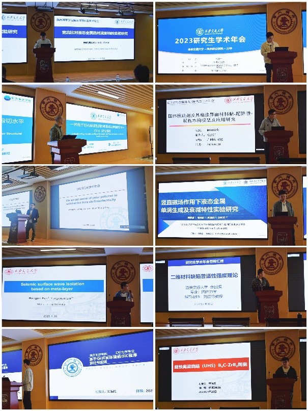 副院长卢同庆、党委副书记李昱静、工程力学系和空天工程系5位评审老师以及百余名研究生参加了此次学术交流。学术年会由兼职辅导员胡娜主持。