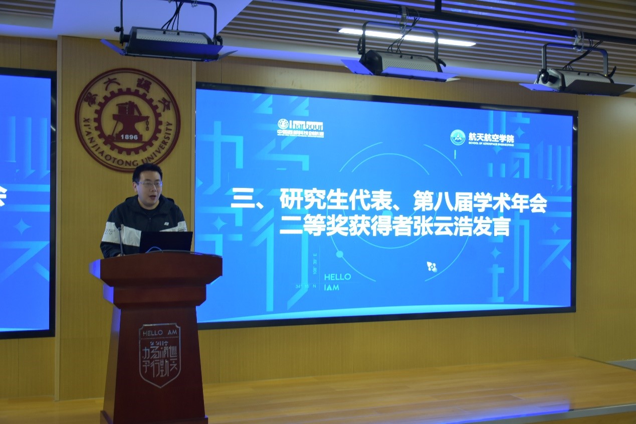 研究生代表、第八届研究生年会二等奖获得者张云浩发言中讲到,学术年会最重要的不仅是介绍最新的研究成果,还要清晰的将自己的观点表达出来。接着他围绕如何做好学术报告和看待学术年会结果向在场的研究生分享了很多建议。