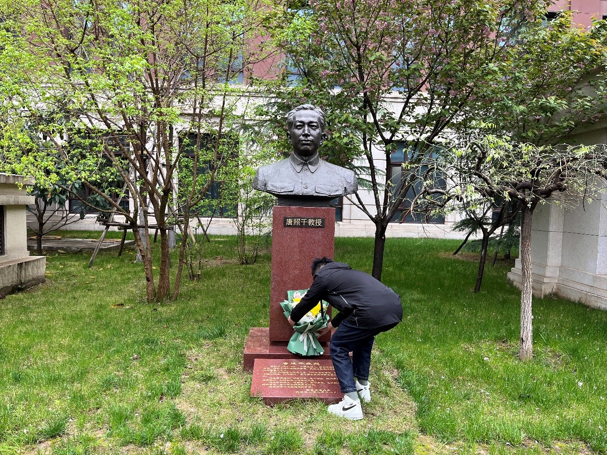 博士力学第三党支部积极分子刘丰恺向唐照千教授雕像敬献鲜花并发表感悟:“大三暑假,我们去合肥的江淮汽车厂做生产实习,时任的总经理是我们工程力学系毕业的老学长,他在给我们这些学弟讲话的时候特别提到,他毕业时荣获唐照千奖学金。可见唐照千教授的名字是我们每一个交大力学人一个闪闪发亮的历久弥新的勋章。激励着我们精勤求学,忠恕任事。唐照千教授本可以选择更优渥的生活条件,但他却选择了投身到艰苦的西北建设中去。他在艰苦的环境中依然做出了学术上的卓越成就。他献身西北,献身科学的精神永远值得我们景仰和缅怀。”