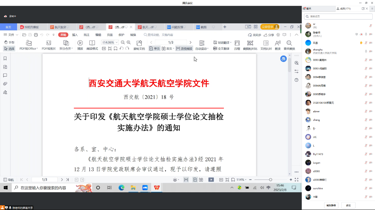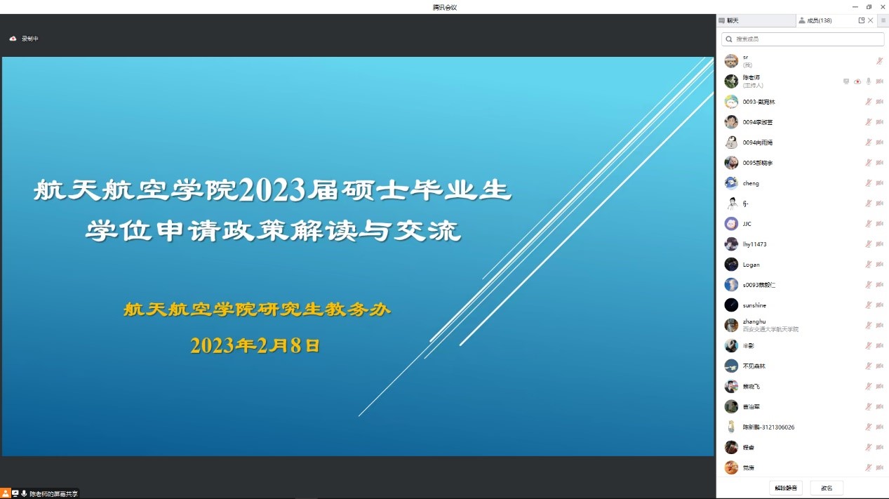 硕士学位论文抽检实施办法》,介绍了硕士论文的抽检原则和比例、抽检方式等,尤其强调了涉密论文在抽检方式上的变化,提醒同学们务必重视论文质量。最后,陈老师为大家展示了《2023年航空航天学院硕士研究生毕业生答辩指南》,详细说明了学位申请和毕业流程、重要时间节点和主要事项,同时也强调了在学位论文撰写过程中要规范学术行为,切勿触及红线。