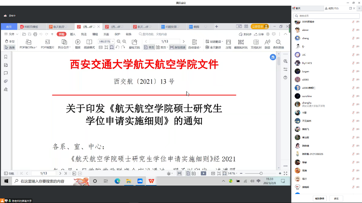 于2月8日下午召开了2023届硕士研究生毕业生学位申请政策解读会。本次会议以线上形式举行,由学院研究生教学秘书陈妮老师主持,全体2023届硕士生及部分低年级硕士生同学参加会议,学院主管研究生工作院长助理张虎老师、学位评定分委员会主席李跃明老师出席会议。