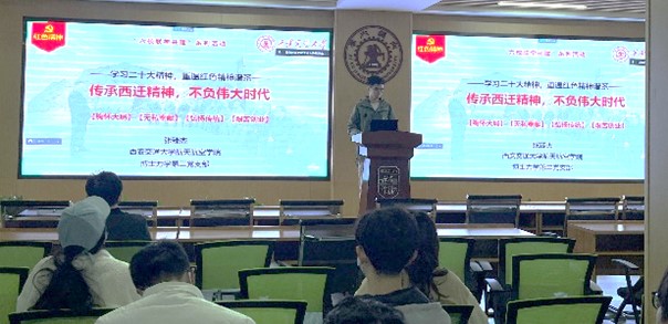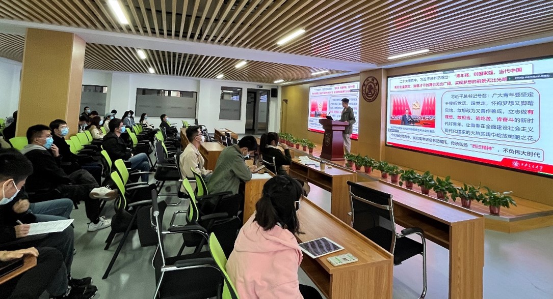 博士力学第二党支部的张臻杰代表西安交大进行领学,报告题目为“传承西迁精神,不负伟大时代”,主要介绍了西迁精神的由来和形成以及西迁精神的时代内涵。