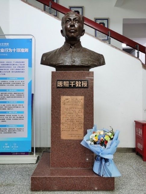 胡奈赛教授分享了自己做科研时的经历与退休后的生活感受,对新一代交大人寄予厚望,希望航天学院青年师生能继承发扬西迁精神,在新时代为祖国的繁荣富强贡献青春力量。访谈结束后,胡奈赛教授将鲜花献于唐照千先生雕像前,向以朱城、唐照千等为代表的西迁前辈致敬。