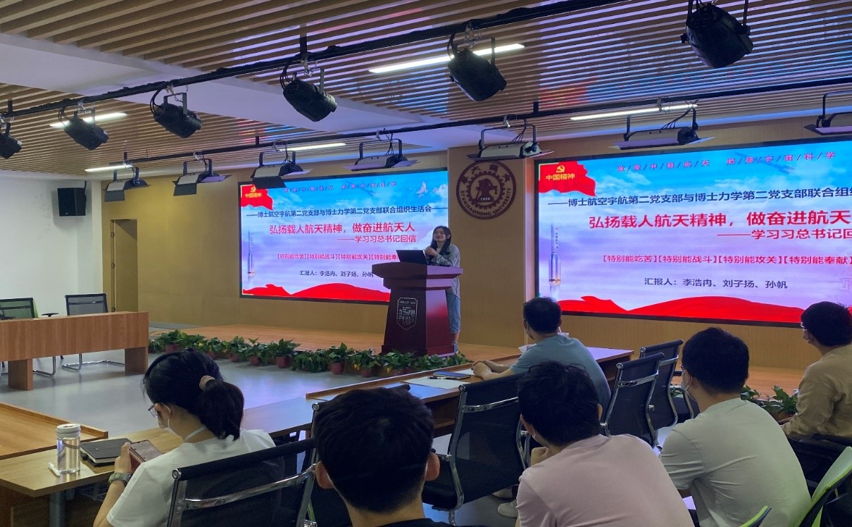 博士航空宇航第二党支部与博士力学第二党支部联合举办了以“弘扬航天精神,做奋进航天人”为主题的联合组织生活会。团工委书记李昱静、分党委秘书韩阳出席本次会议并作指导,博士航空宇航第二党支部与博士力学第二党支部全体成员参会。会议由博士力学第二党支部支部书记邢文思主持。