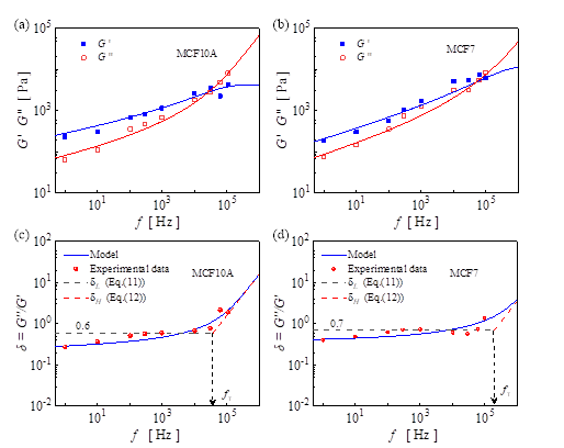 图4自相似多级结构模型与实验所得到的MCF10A和MCF7细胞的复模量和损耗角正切值结果对比