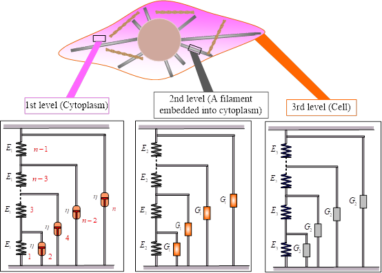 徐光魁教授团队通过考虑细胞骨架的多级结构特征,建立了细胞的自相似多级结构模型(图1),结合实验结果发现:在低频率下,细胞的储能模量和耗能模量均表现出对频率的弱幂律依赖性;在高频下,储能模量近似为常数,而耗能模量与频率成线性关系。此外,自相似多级结构模型的转折频率可以描述不同细胞状态或类型的粘弹性力学响应差异,还可以定量地表征恶性肿瘤细胞与健康细胞的差异。
