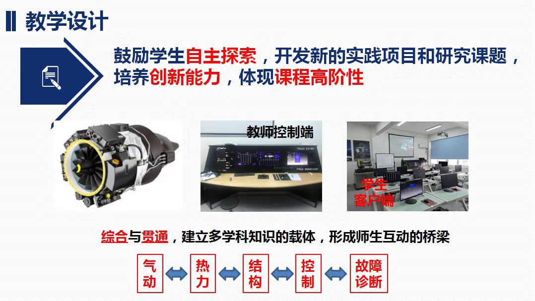 创新型教学赛道中,雷蒋老师及教学团队以航空发动机总体专业人才培养为目标,面向专业教学痛点,开展教学改革,建设了虚拟实验与实际操作相结合的航空发动机综合实践平台,探索了课堂讲授与自主探索相结合,师生双向良性互动的创新教学模式。将课程思政、新平台与新技术、任务与考核模式多样化、培养资助探索能力等方面的创新理念,融入课程教学改革的措施和方法之中,取得了良好效果。与理论课互为依托,调动了学生的学习积极性,提升了学生对专业的认同感,为航空发动机专业人才的培养打下良好基础。