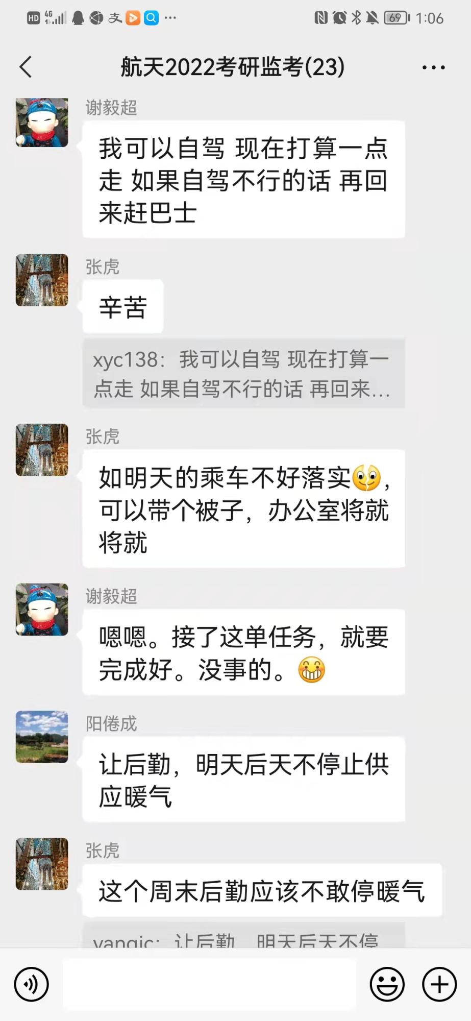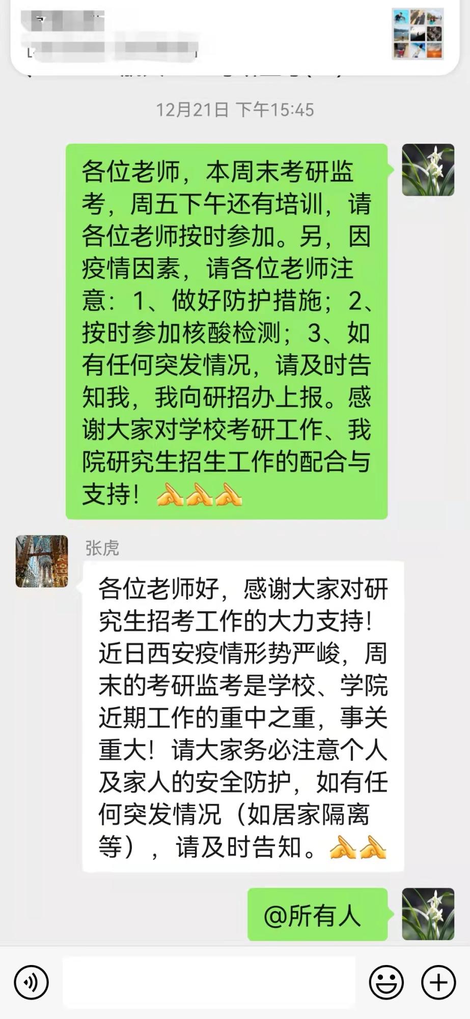 选派了20名经验丰富、认真负责的教职工担任2022年硕士研究生入学考试监考工作。从12月中旬开始,西安疫情进入严峻态势,考研前2周,一方面通过网页、qq群、微信群等途径通知考生填写情况摸排,了解考生动态信息,另一方面,每日动态统计监考老师身体状况,提醒防疫要求,制定协调预案,一旦出现突发情况立即上报并启动补救措施。考研前,院长助理张虎代表学院向各位监考老师对学院研究生招生工作的大力支持表示感谢,强调做好疫情防控和坚守监考职责的重要性,并积极协调各方解决监考老师的实际困难。家住创新港的谢毅超老师表示,虽然目前疫情严重,但既然接了监考任务,无论如何都要克服困难把它完成好!