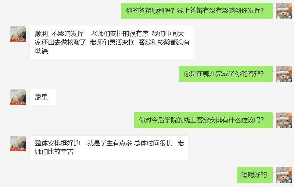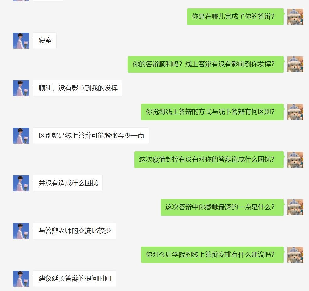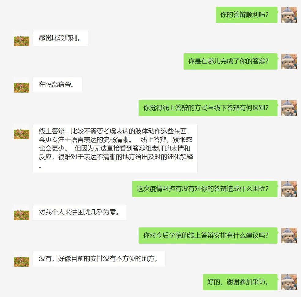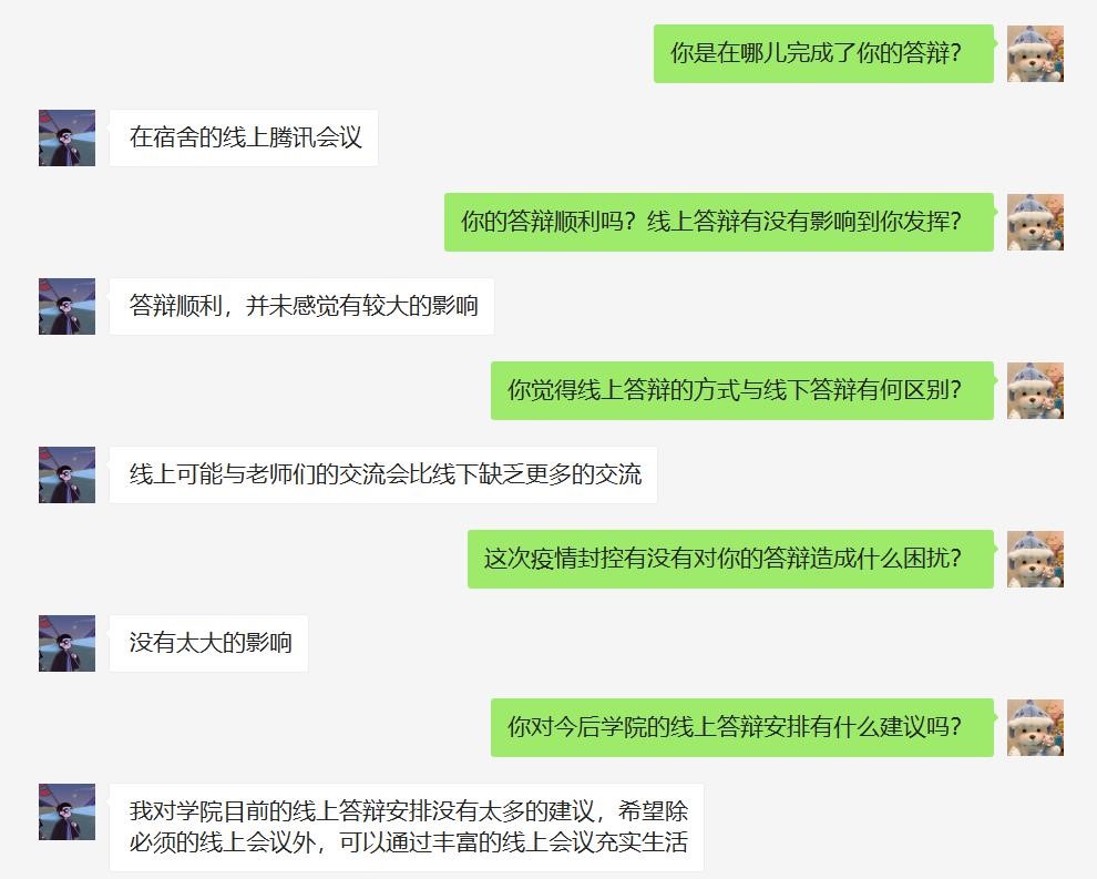 参加考核的同学们一致认为,疫情封控虽然给学习、生活带来一定不便,但是学院对考核流程的科学、合理、人性化安排使得自己仍能稳定发挥。硕0093班的严寒雪玉同学认为“线上答辩紧张感会更少”,并且会更“专注于语言表达的流畅清晰”;博2044班的谭楷同学说,虽然答辩过程中大家收到核酸检测通知,但是“老师们灵活调整,答辩和核酸检测都没有耽误”。