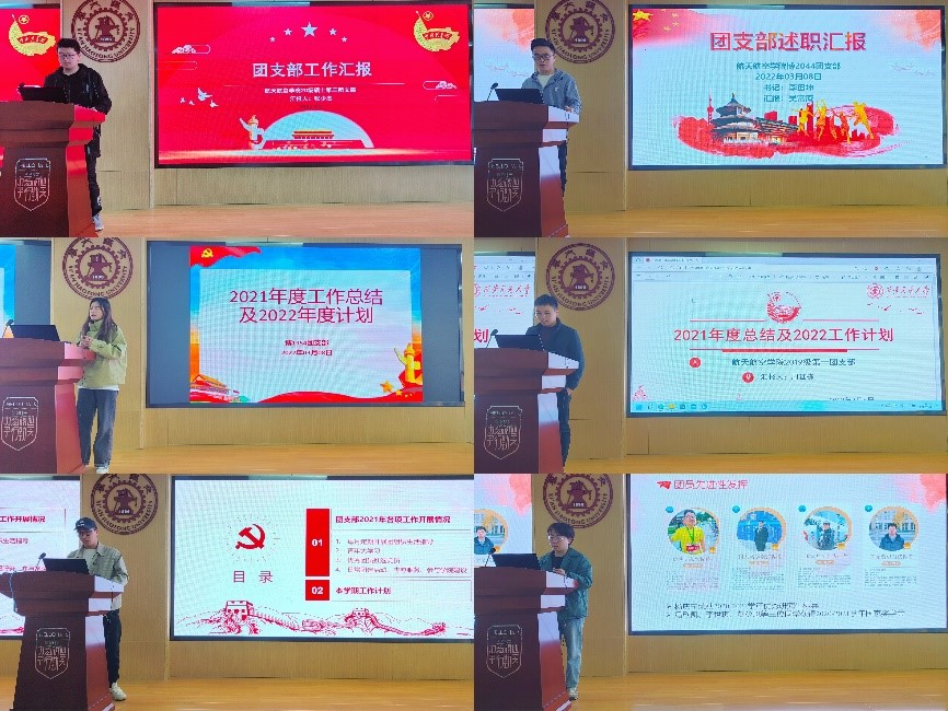 14名团支部书记依次对2021年度的工作进行了汇报,各团支部书记对本支部的基本信息、人员架构、“三会两制一课”制度落实情况、开展主题团日活动情况、班级同学入党情况、党团联系情况、组织生活会开展情况以及团支部先进成果和志愿服务情况等进行了简要介绍。在总结上一年度工作后,各团支部也分析了本支部工作的不足,提出了进一步的工作计划及改进措施,纷纷表示今后将在研究生群体中更好地发挥团支部先进引领作用,开展更加丰富多彩、充满空天特色的团日活动。