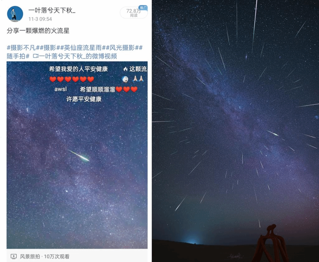 2021年8月,任雨枫拍摄了一个英仙座流星雨小视频,镜头捕捉到一颗爆燃的火流星在视野中央炸开,还有余烟袅袅,截止现在,视频播放量超过10万次。“摄影对我来说有一个正向激励作用,我拍的照片分享后,得到了别人的认可,这样就形成一个正反馈,我对摄影的兴趣就会越来越浓厚,再加上我本身学的专业是航空航天,就会去关注一些更加新奇的拍法和角度。最近对拍摄星轨、时间合成的照片非常感兴趣。”