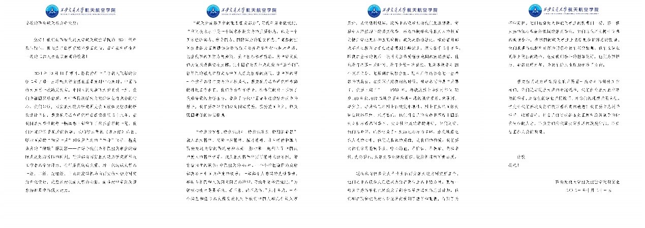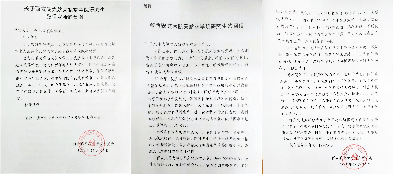 信件得到了西安航天动力研究所的回复,西安航天动力研究所感谢了同学们对航天事业的关心,向同学们致以问候,并寄语同学们向自己的恩师和前辈学长学习,永葆科技强国的初心、树立为复兴中华民族而奋斗的远大理想,刻苦学习、不断面向科技最前沿锻炼自己的本领,饮水思源、感恩社会,在未来的人生道路上把准方向、破浪前行。